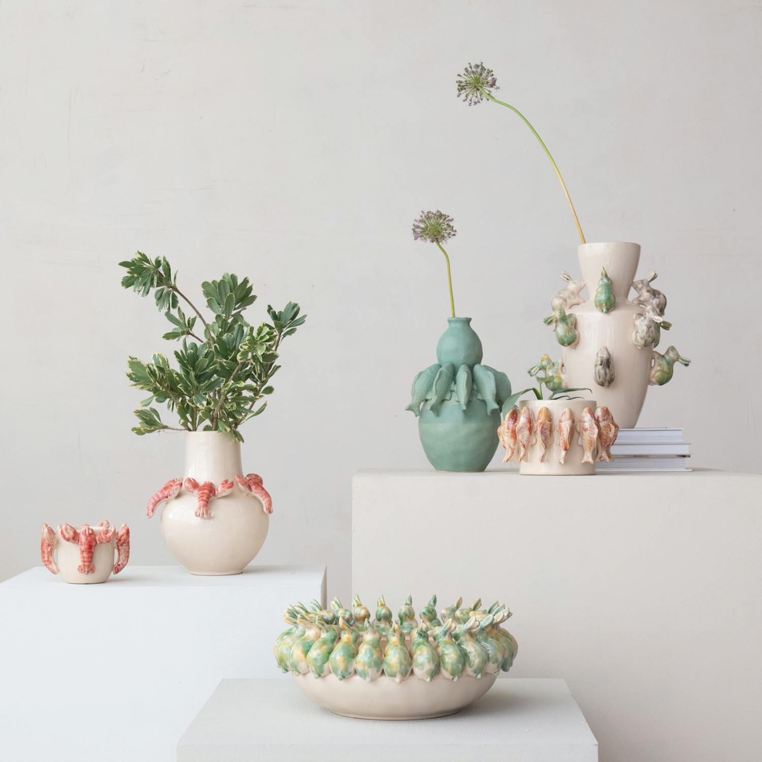 Decorative Stoneware Bowl w/ 3D Rabbits, Reactive Glaze (Each One Will Vary)