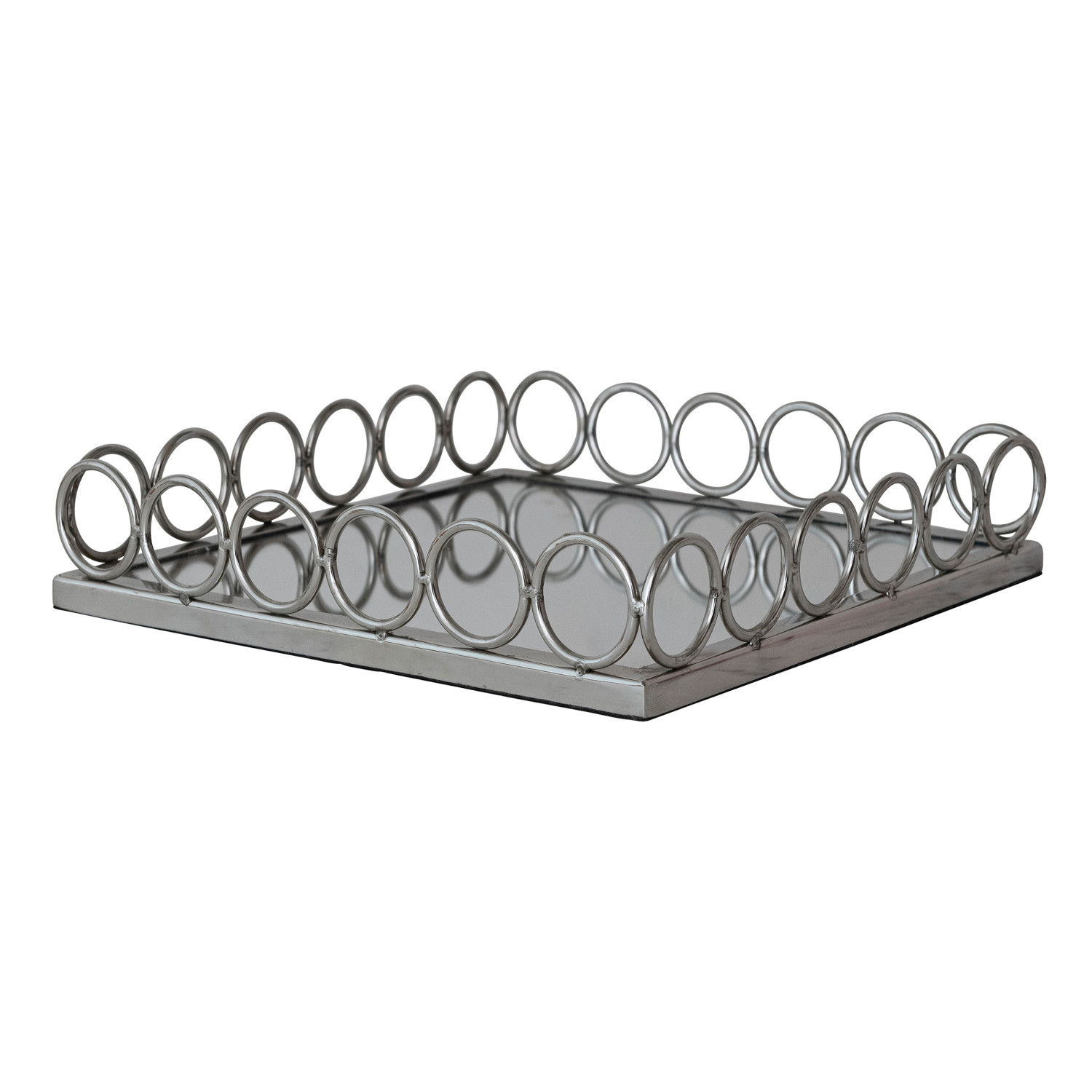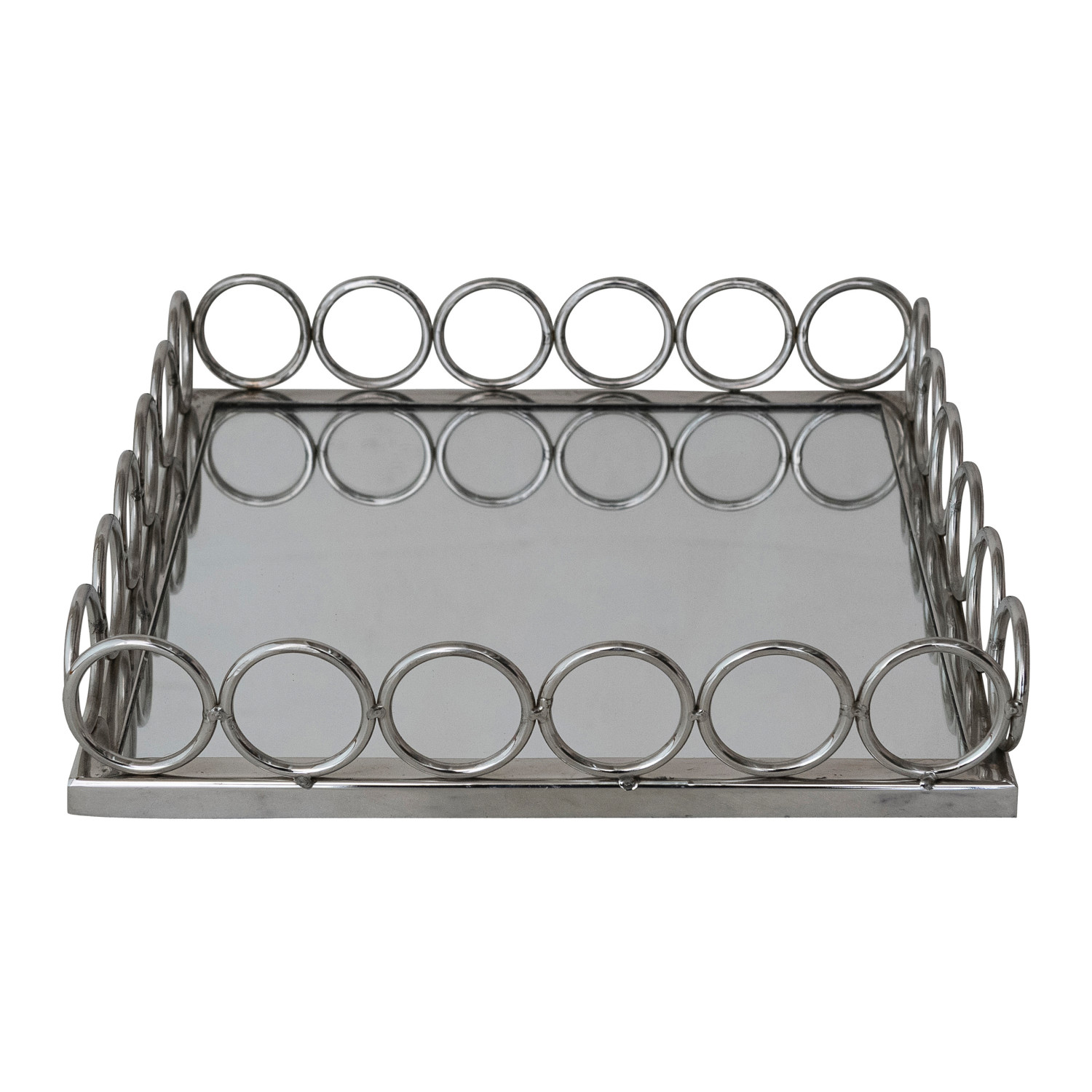 Catalog Name: 12" Square x 2-1/2"H MDF & Metal Ring Mirrored Tray, Nickel Finish