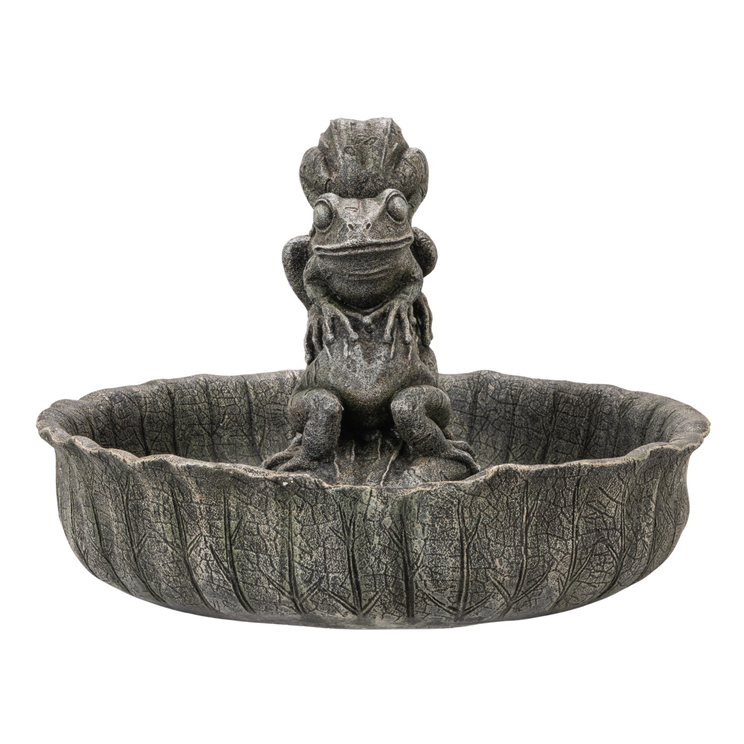 Catalog Name: 20" Round x 13-3/4"H Resin Lotus Leaf Shaped Fountain w/ Frogs, 6' Cord, Verdigris Finish, Truck Ship (Includes Pump Kit)