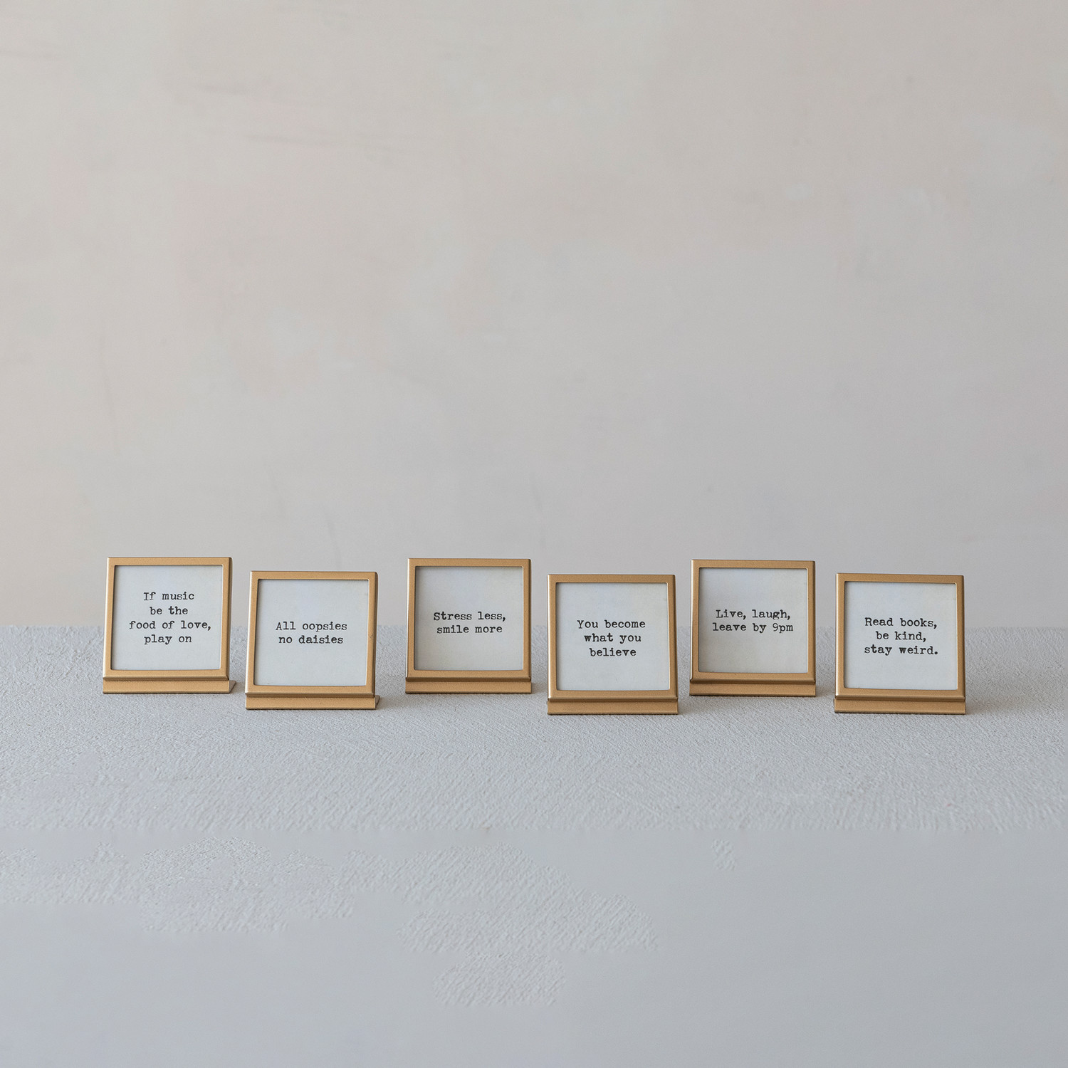 Metal & Glass Frame with Easel & Saying, Gold Finish, 6 Styles (Holds 3" Square Photo)