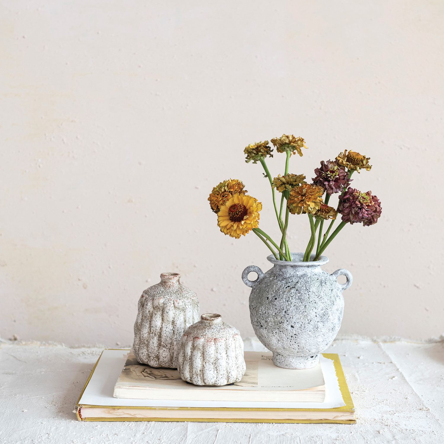 This unique stoneware vase with handles is a stunning example of high-temperature fired ceramic. It features a round shape with two handles and a matte grey color, giving it a vintage and rustic look. The vase is adorned with a distressed reactive glaze, a unique technique that reacts with the clay to create various effects. This unique feature adds character and charm to the vase. It can be used to display flowers, branches, or greenery, or as a decorative accent. Place it on tables, shelves, mantels, or windowsills, and create a cozy and elegant atmosphere in the home. This vase is suitable for various styles, including French country, traditional, global, vintage, or coastal, and can create a sophisticated and elegant look in any space. It's a perfect gift for art and nature lovers.
