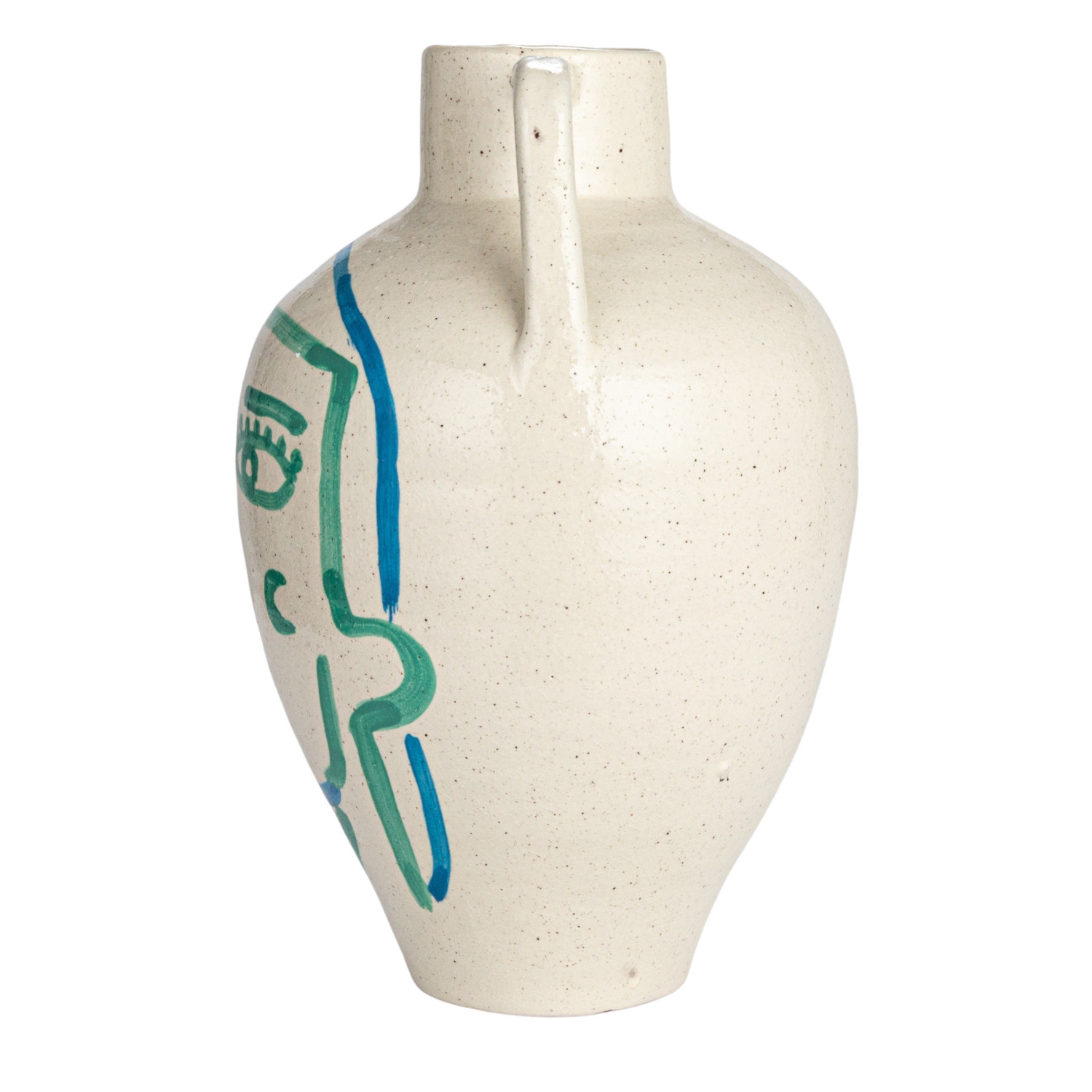 This hand-painted terra-cotta vase features an abstract face and crackle glaze in white, blue, and aqua colors. It is a unique and beautiful home accessory, made of baked clay with a porous and earthy texture. The vase has a round shape and wide opening, and its hand-painted design adds a playful and artistic touch. The crackle glaze creates a glossy surface, while the white, blue, and aqua color scheme adds a cozy and elegant look. This vase can be used to display fresh or artificial flowers, plants, or branches, or as a sculptural accent. Place it on tables, shelves, mantels, or windowsills, and create a cozy and inviting atmosphere in the home. It is suitable for farmhouse, coastal, French country, cottagecore, or boho style and adds personality and charm to any space. Truck shipping is required due to its size and weight.
