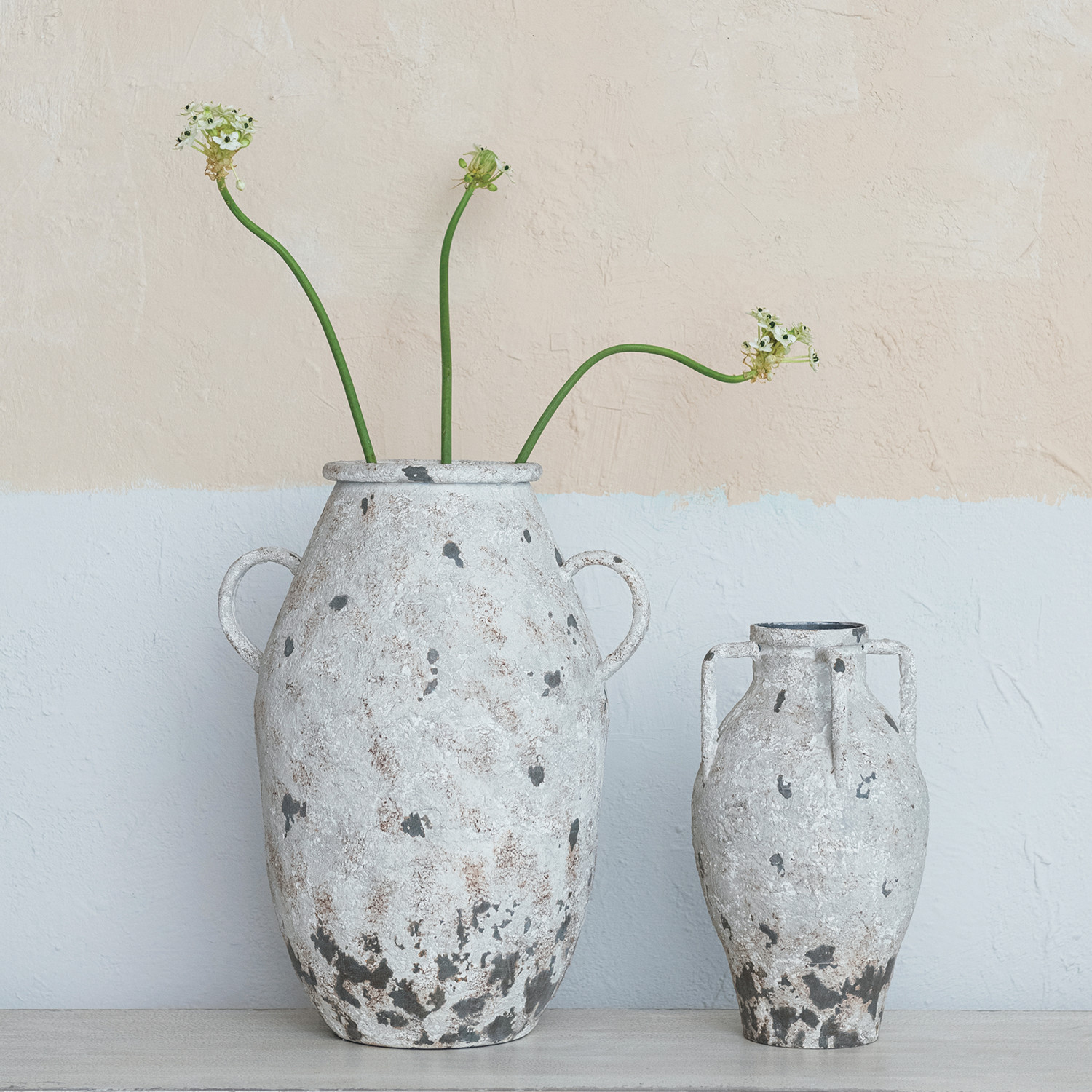 This Round Metal Urn exudes a sense of history with its heavily distressed white finish and traditional form. The design features two handles that add functionality and aesthetic appeal, making it a versatile piece for any room. It resonates with the rustic charm of farmhouse decor, the refined elegance of French country style, and the whimsical allure of cottagecore. Crafted from durable metal, it promises to be a lasting addition to any collection. The urn stands at 15.25 inches high and spans 8.25 inches round, offering ample space for creative expression whether filled with blooms or displayed as is.