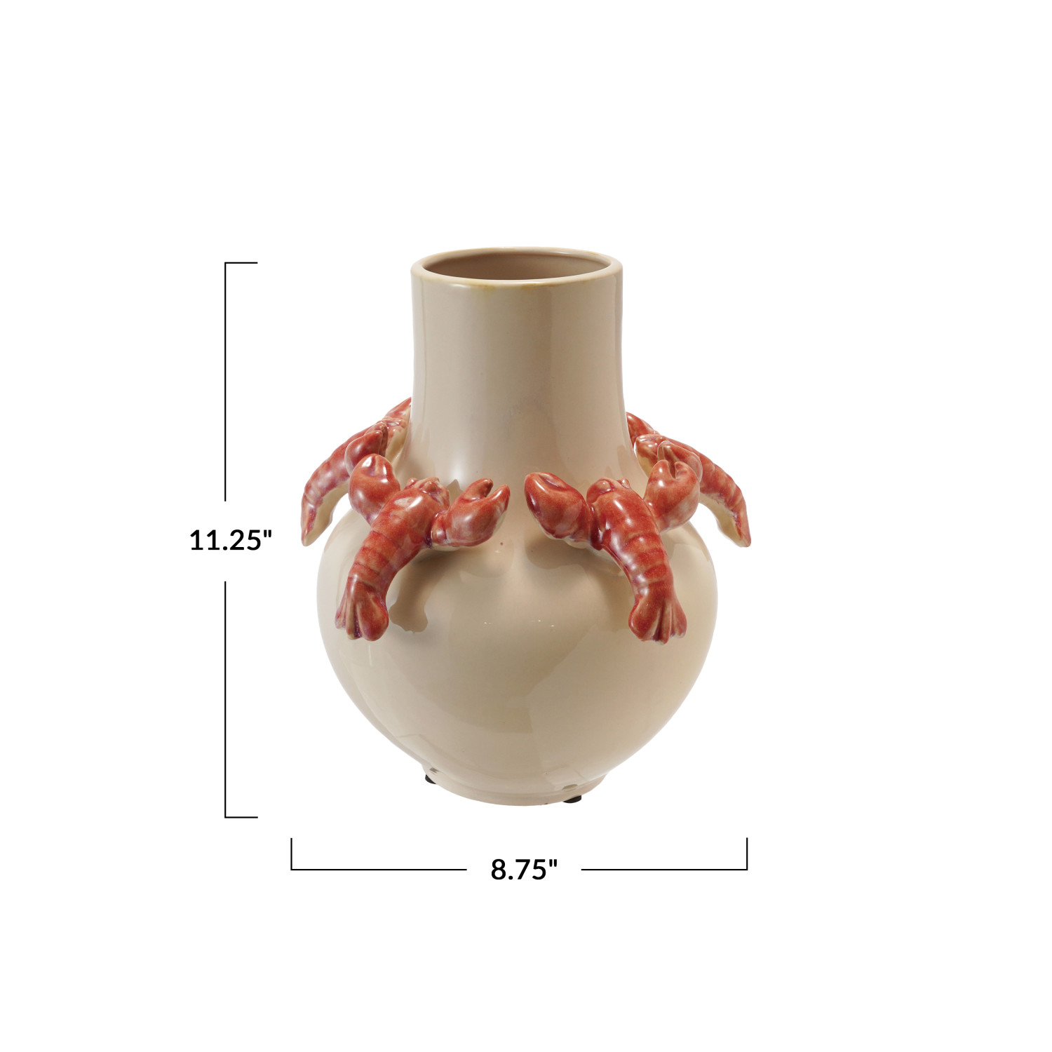 Catalog Name: 8-3/4" Round x 11-1/4"H Stoneware Vase w/ 3D Lobsters, Reactive Glaze, Cream & Orange Color, Truck Ship (Each One Will Vary)