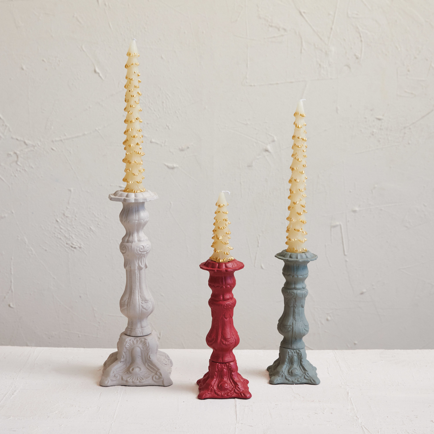 This aluminum taper candleholder in green is a striking piece that combines timeless design with contemporary appeal. The embossed details add a touch of texture and depth, while the variety of color options ensures a perfect match for any interior palette. Its stature makes it an ideal focal point for any setting, inviting a sense of grandeur and sophistication. Whether used as part of a centerpiece arrangement or as a standalone piece, this candleholder is sure to draw the eye and elevate the ambiance of the home. Elegant and durable, it's a candleholder that will be admired for years to come. An exquisite, embossed cast aluminum taper candleholder, standing tall with a refined silhouette in green. A piece that exudes sophistication, it's a versatile addition to any decor, from modern minimalism to classic opulence. Ideal for creating an elevated look on the dining table or as a stately decorative accent in any living space.