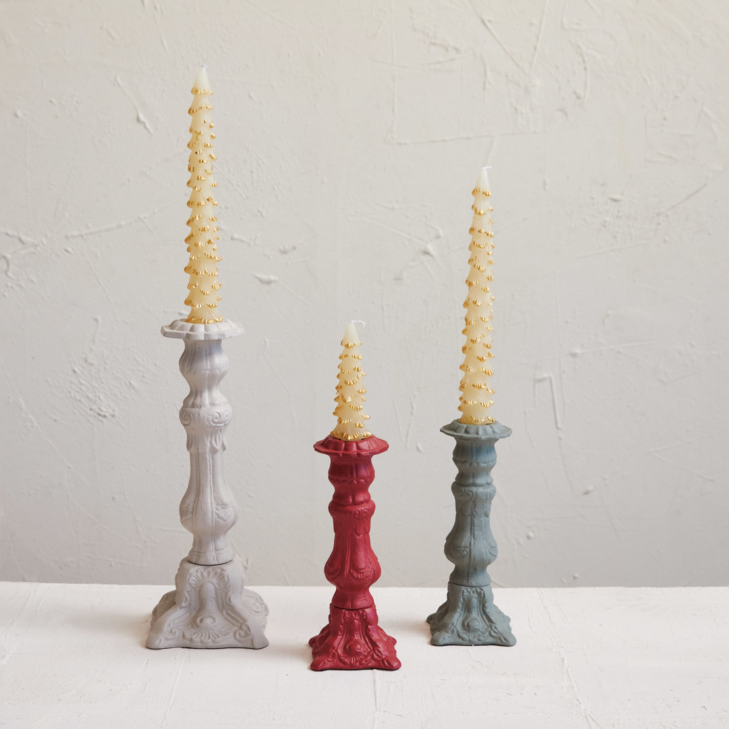 This aluminum taper candleholder in grey is a striking piece that combines timeless design with contemporary appeal. The embossed details add a touch of texture and depth, while the variety of color options ensures a perfect match for any interior palette. Its stature makes it an ideal focal point for any setting, inviting a sense of grandeur and sophistication. Whether used as part of a centerpiece arrangement or as a standalone piece, this candleholder is sure to draw the eye and elevate the ambiance of the home. Elegant and durable, it's a candleholder that will be admired for years to come. An exquisite, embossed cast aluminum taper candleholder, standing tall with a refined silhouette in grey. A piece that exudes sophistication, it's a versatile addition to any decor, from modern minimalism to classic opulence. Ideal for creating an elevated look on the dining table or as a stately decorative accent in any living space.