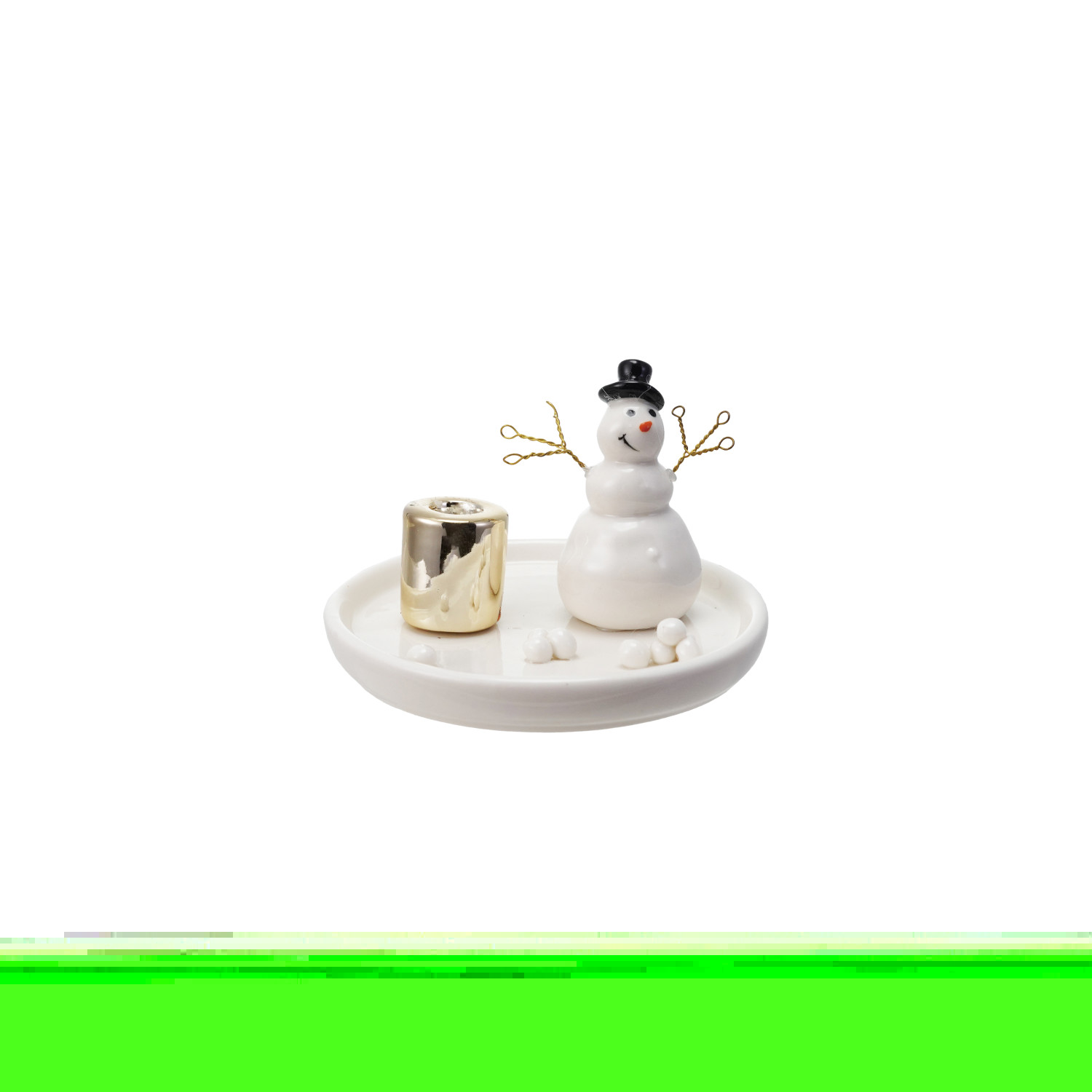 Catalog Name: 4" Round x 2-1/2"H Stoneware & Wire Taper Holder w/ Snowman & Gold Electroplating, White & Black (Holds 1/2" Taper)