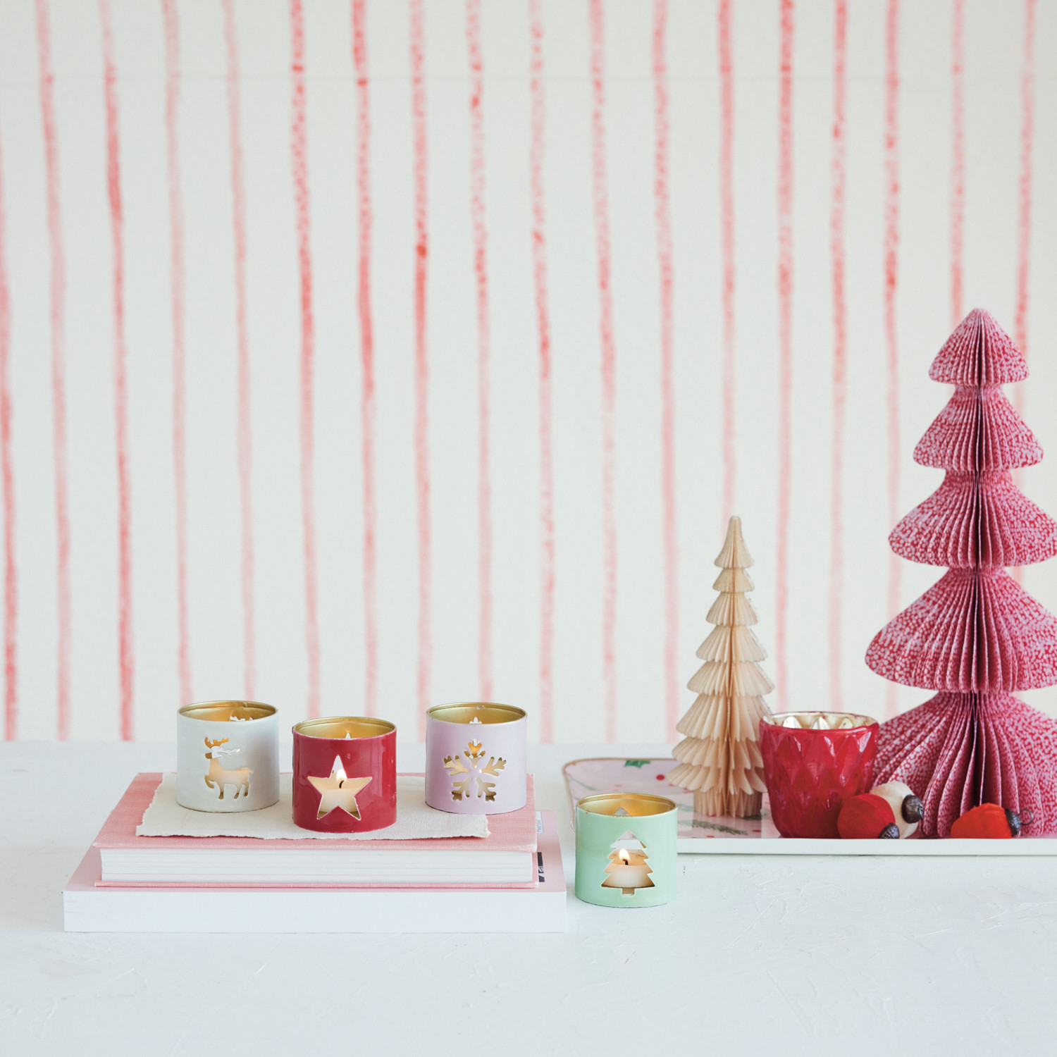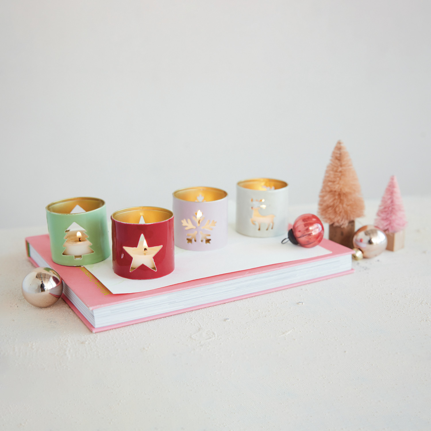 Enameled Metal Tealight Holder with Holiday Icon Cut-Outs, 4 Styles