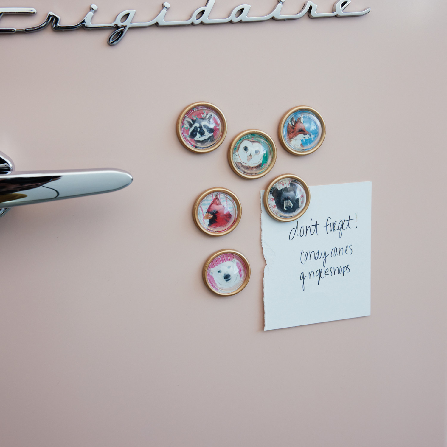 Catalog Name: 1" Round Resin Convex Magnets on Metal Card w/ Holiday Patterns & Animals, Multi Color, Set of 6 ©