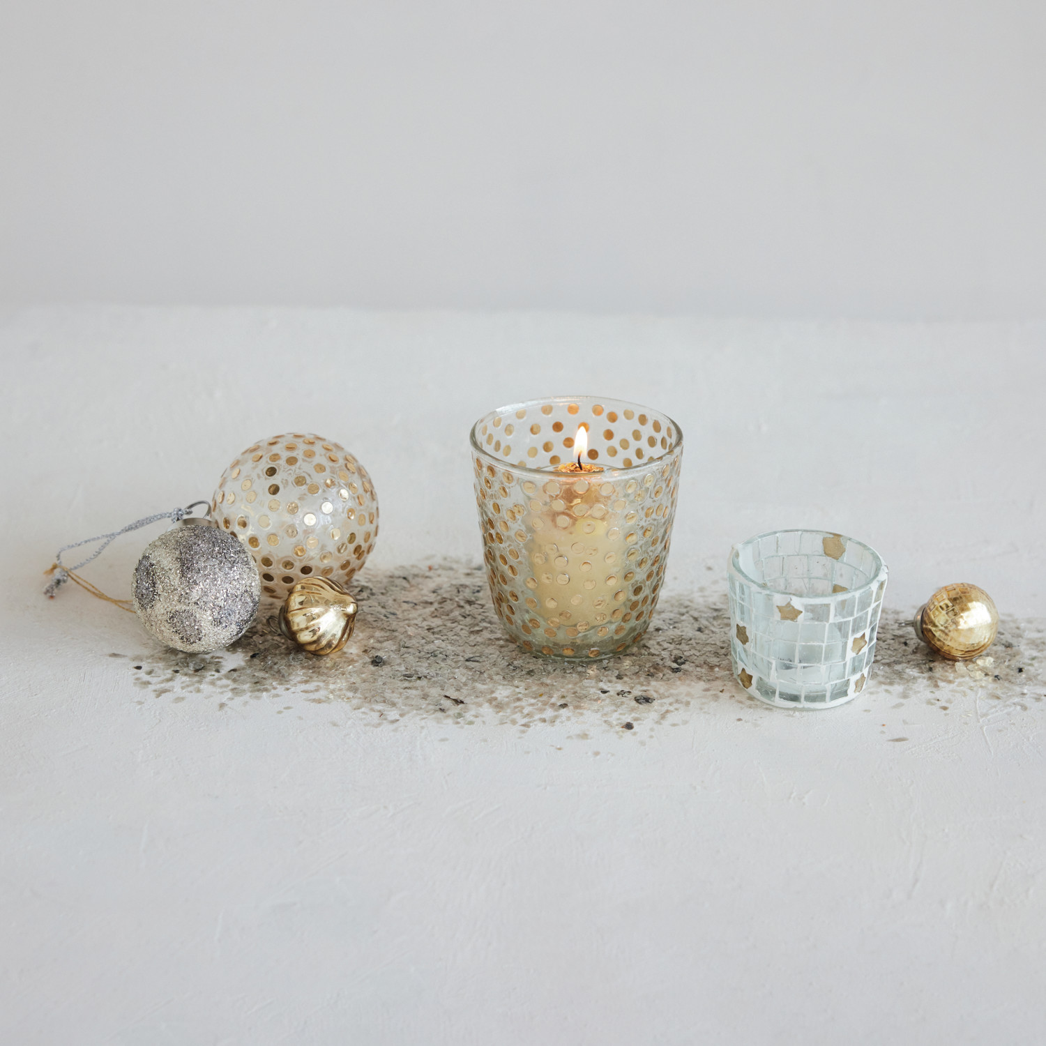Glass Tealight/Votive Holder with Embedded Sequins, Gold Finish