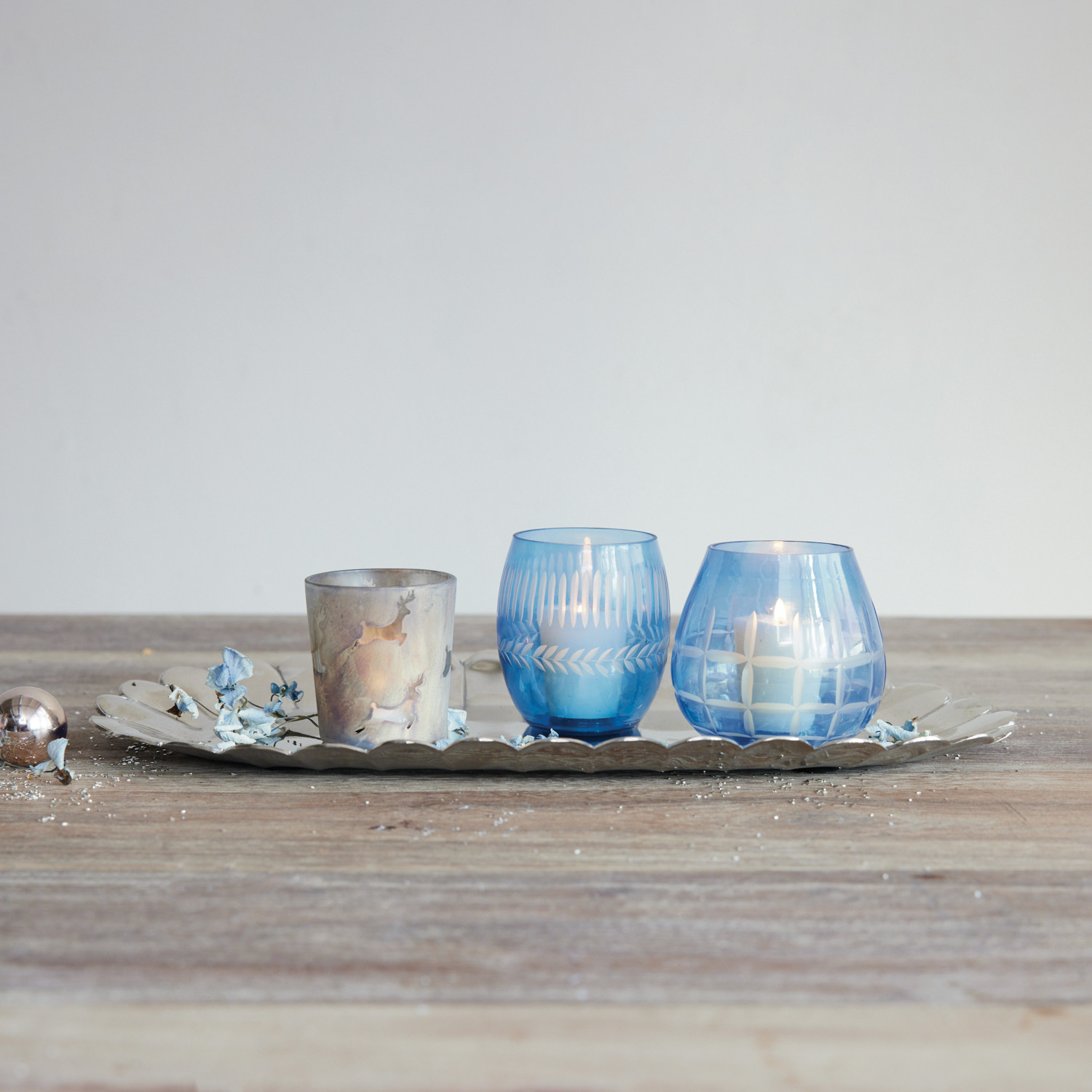 Glass Tealight/Votive Holder with Reindeer Pattern, Antique Frosted Silver Finish