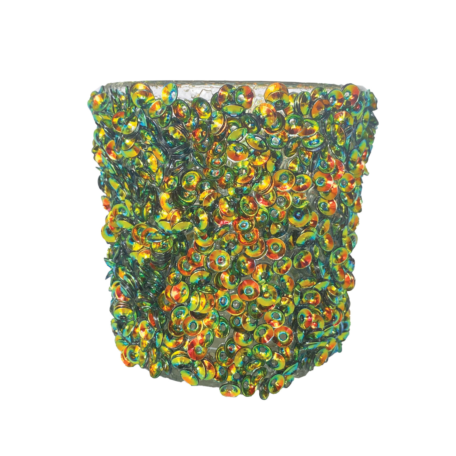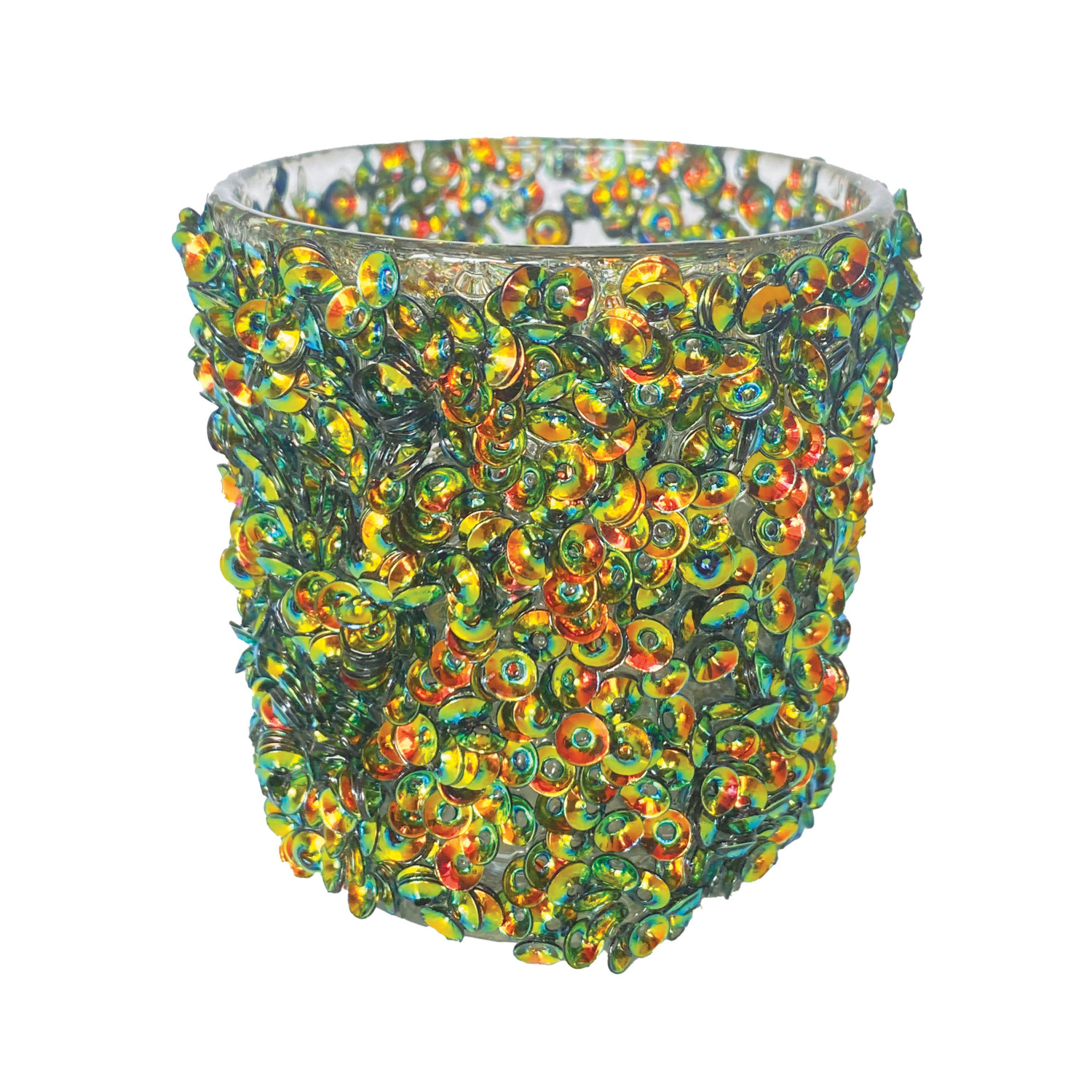 Catalog Name: 2-1/2" Round x 2-3/4"H Handmade Glass Tealight/Votive Holder w/ Iridescent Sequins, Multi Color
