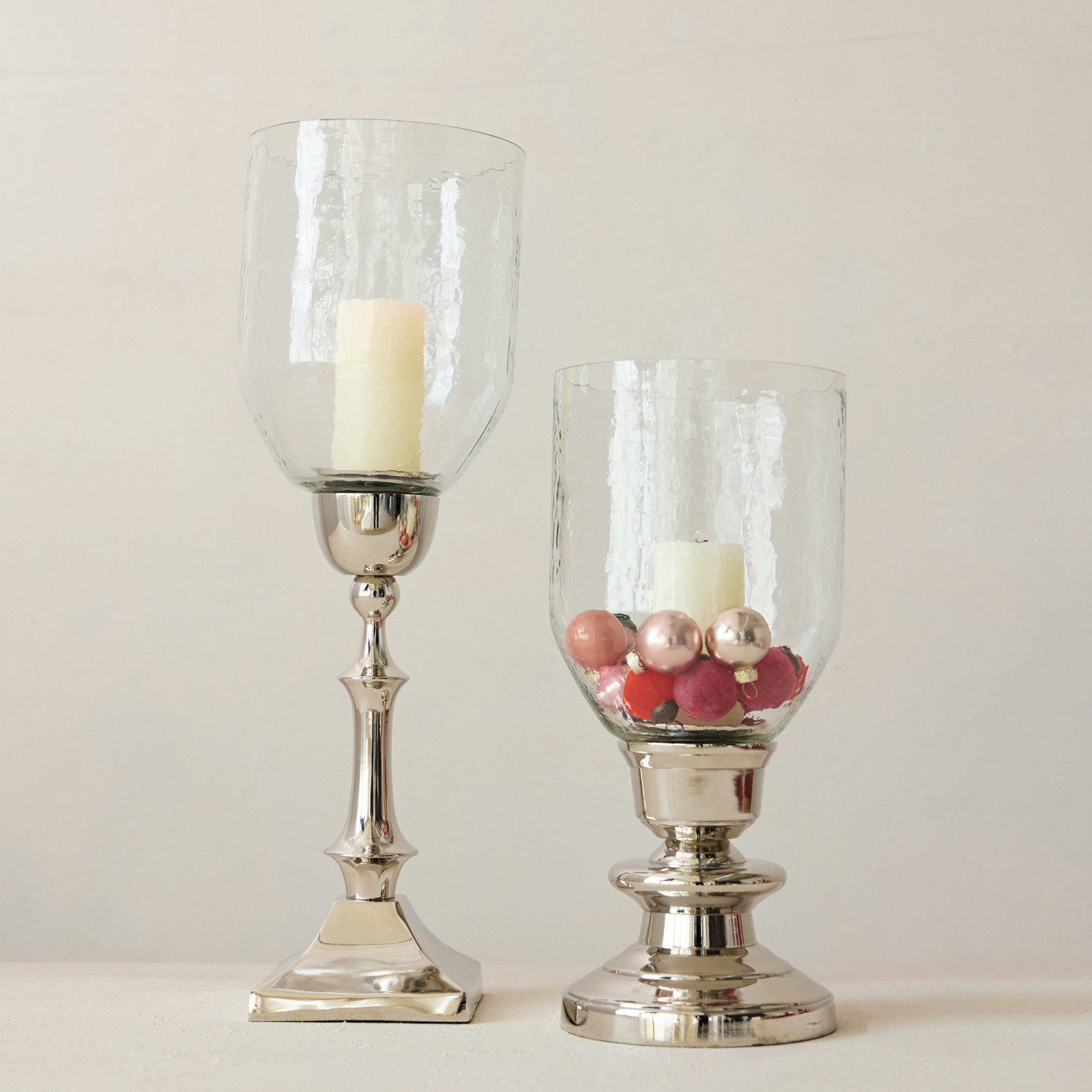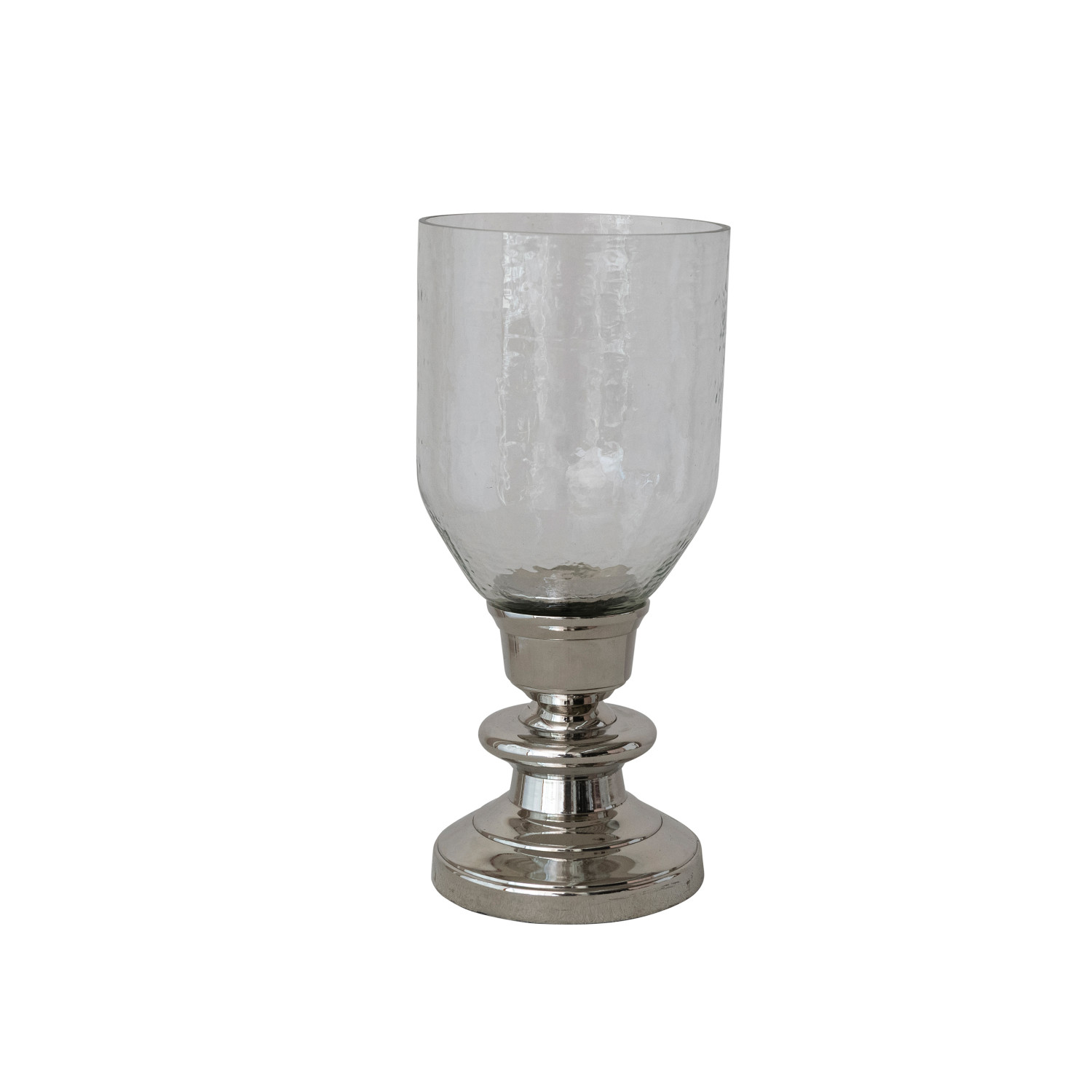 Catalog Name: 6-1/4" Round x 14"H Glass Hurricane w/ Cast Aluminum Base, Nickel Finish, KD (Holds 2-1/2" Pillar)