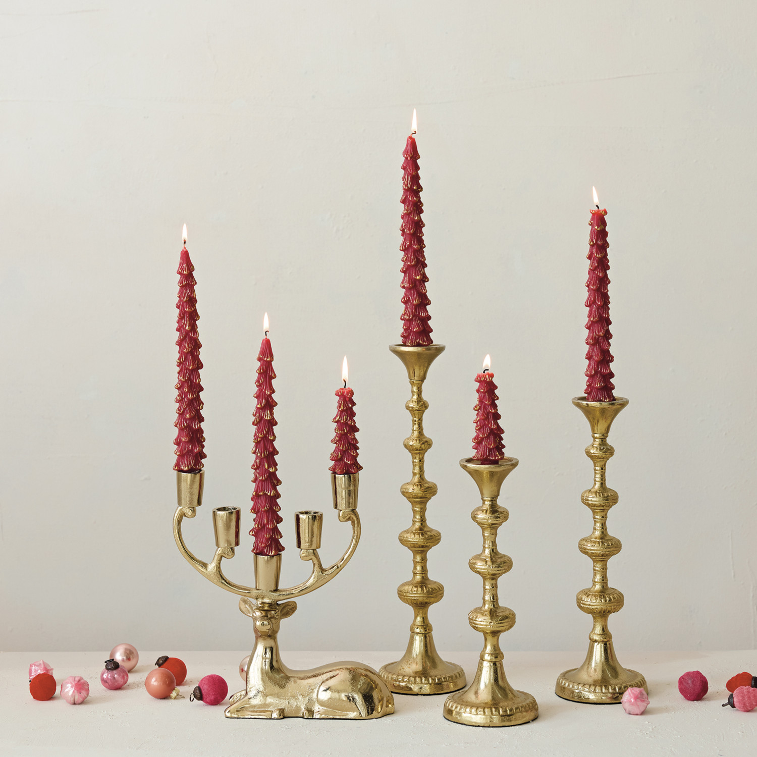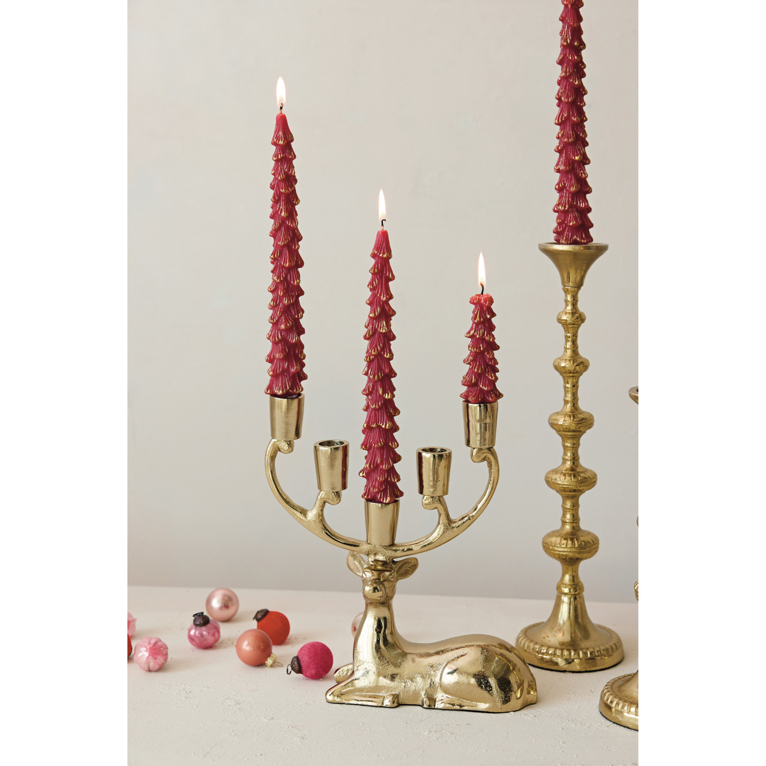 Catalog Name: 9-1/2"L x 3"W x 10-1/4"H Cast Aluminum Deer Candelabra, Gold Finish (Holds 5 Tapers)