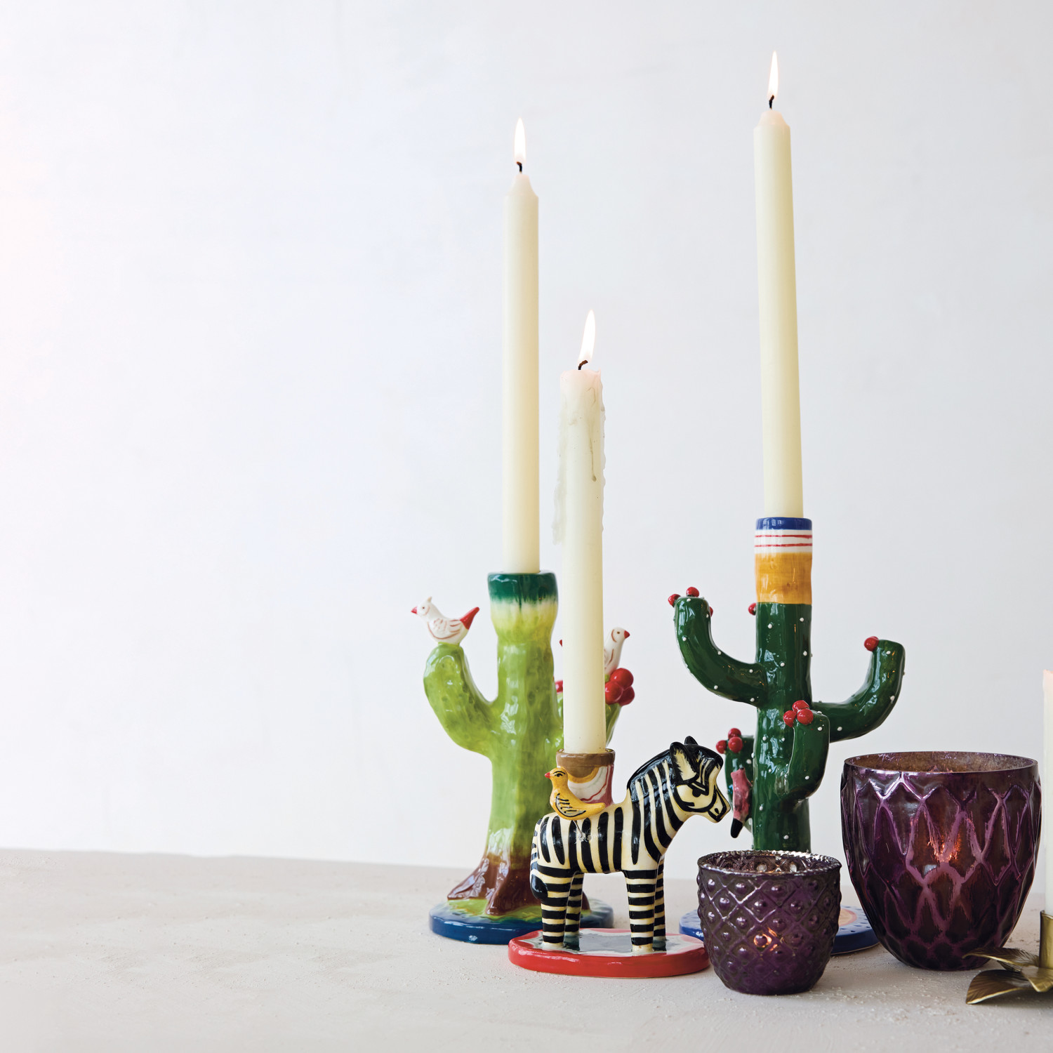 Catalog Name: 5-1/2" Round x 9"H Hand-Painted Ceramic Vintage Reproduction Cactus Shaped Taper Holder w/ Bird, Multi Color
