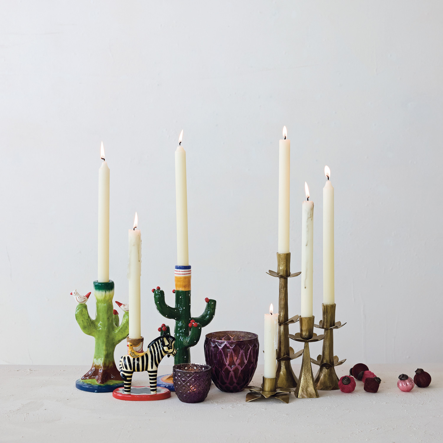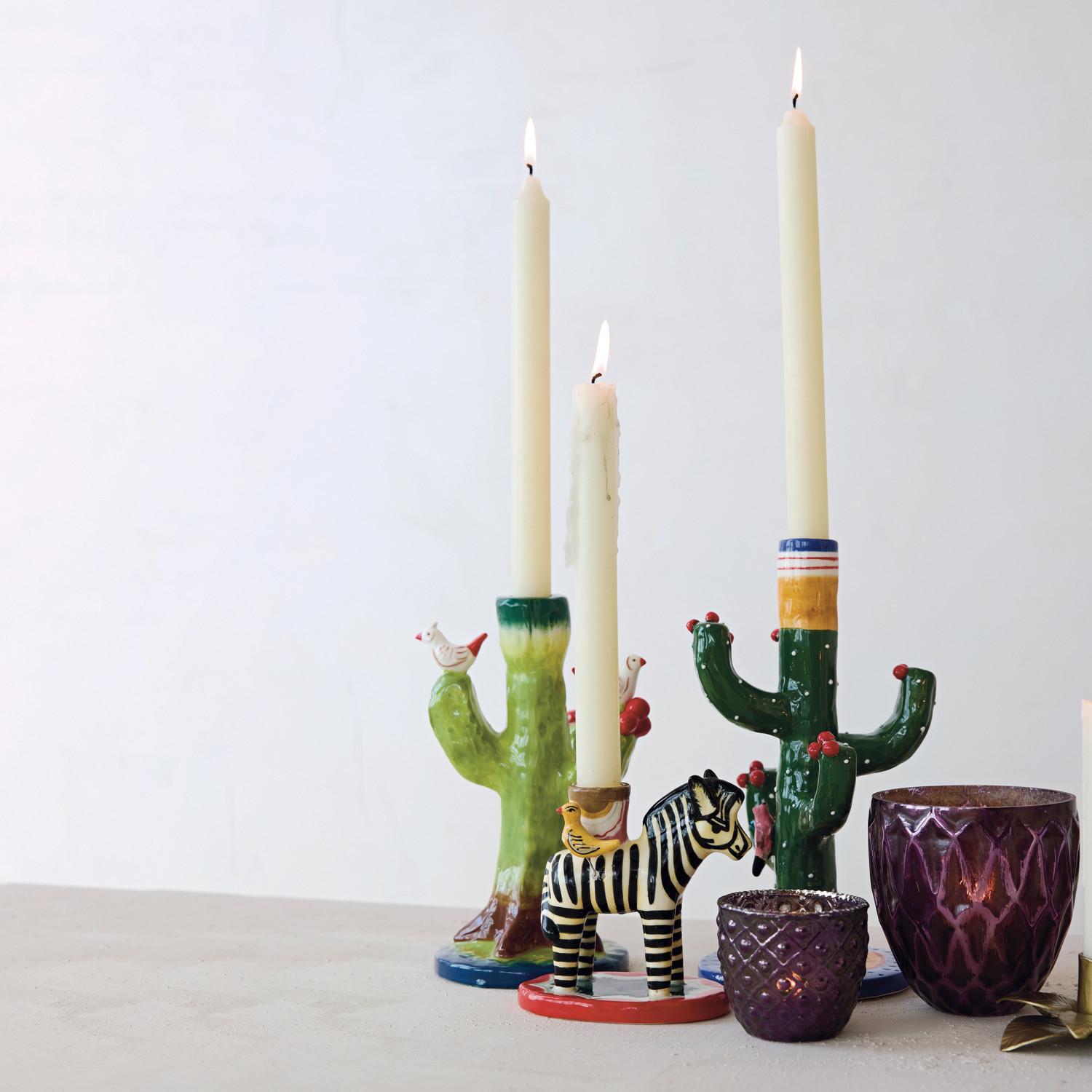 Hand-Painted Stoneware Vintage Reproduction Zebra Shaped Taper Holder with Birds