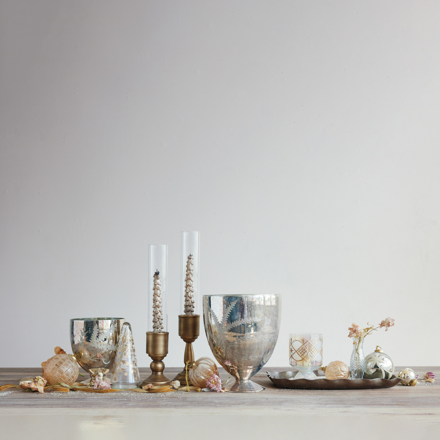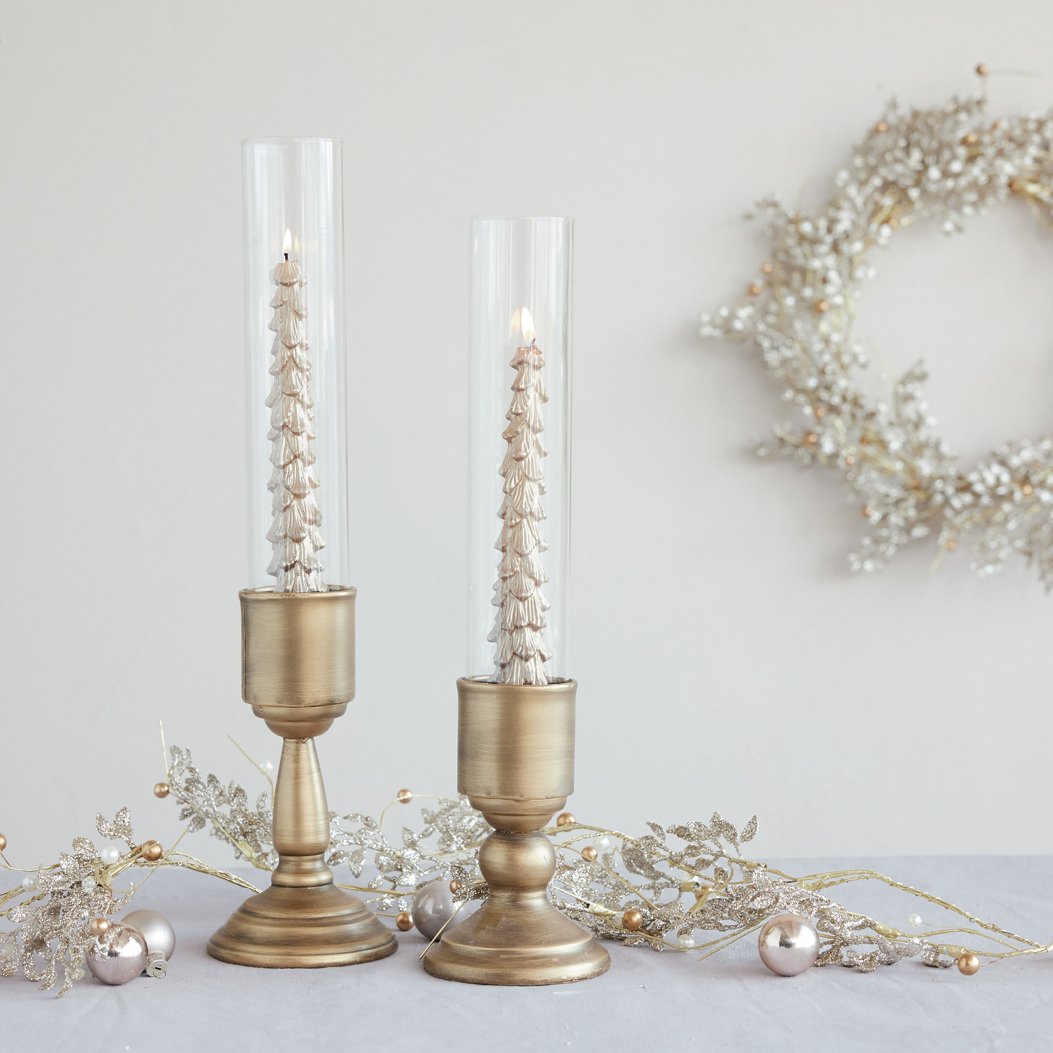 Metal Taper Holder with Glass Hurricane, Gold Finish, Set of 2