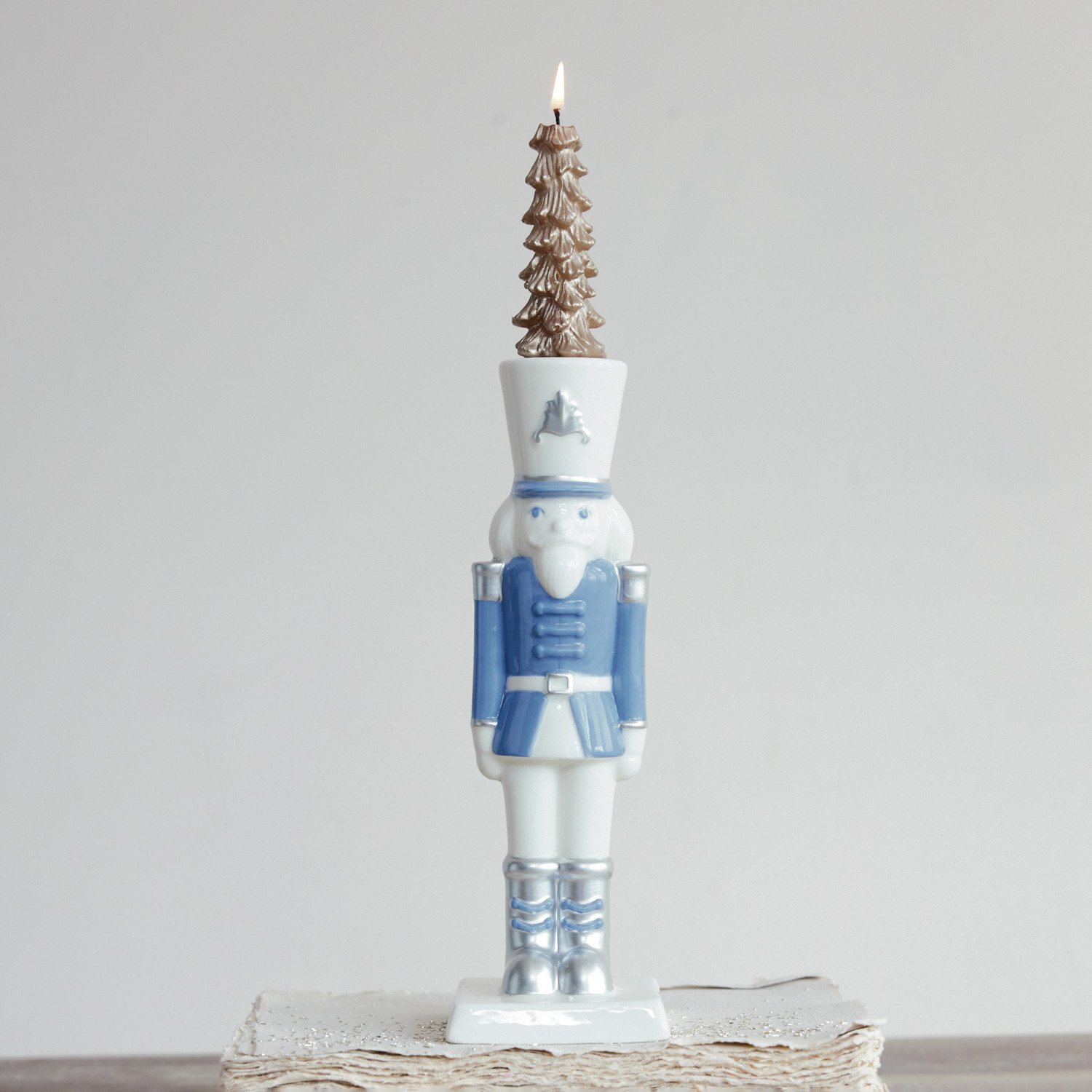 Ceramic Nutcracker Shaped Taper Holder with Silver Electroplating, White & Blue