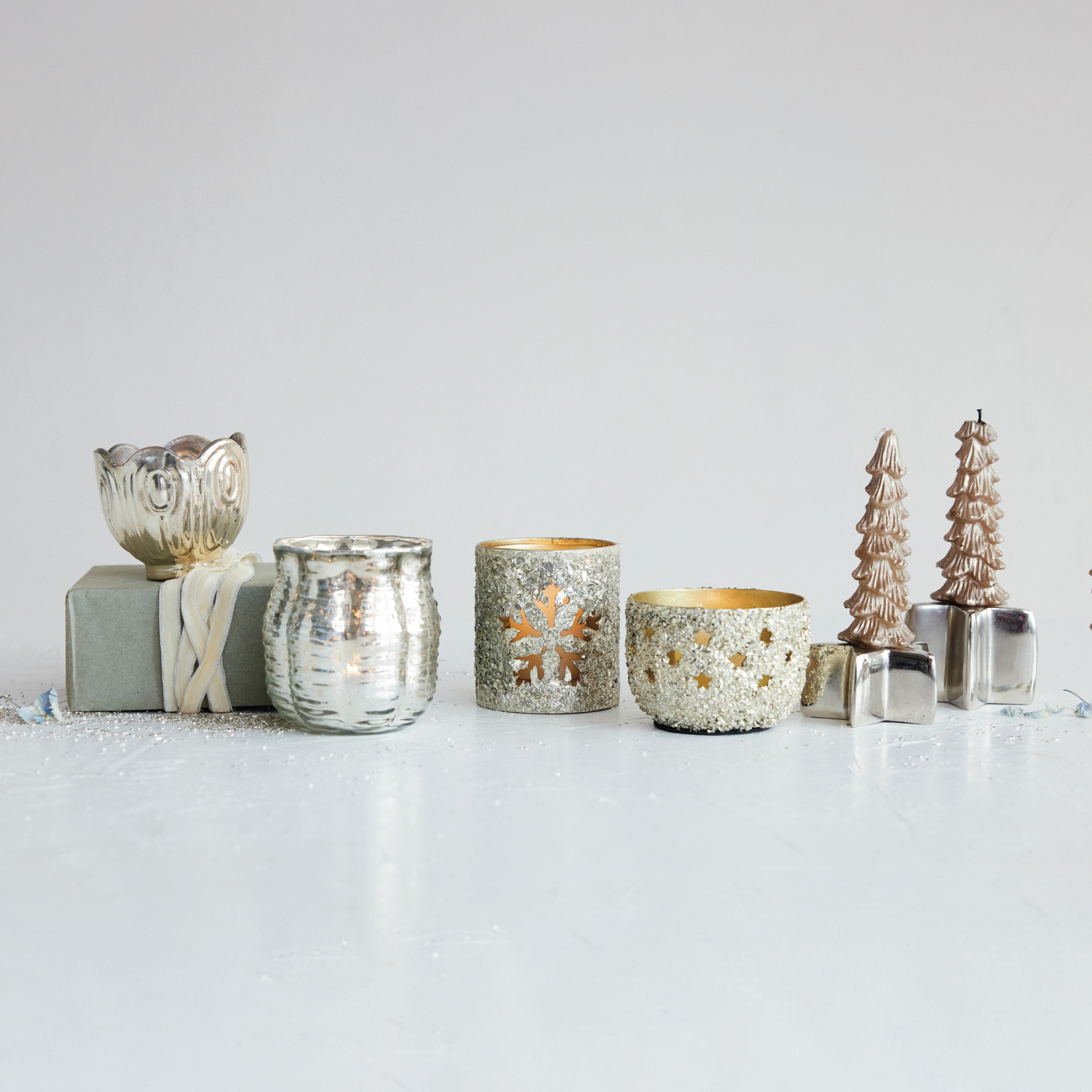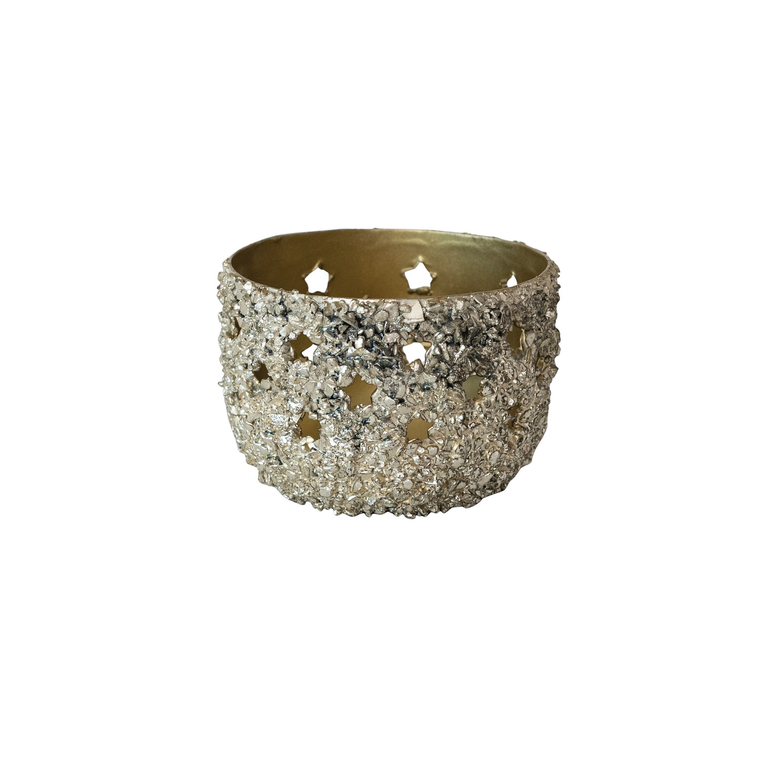 Catalog Name: 3-1/2" Round x 2-1/4"H Metal Tealight/Votive Holder w/ Mica Flakes & Star Cut-Outs, Antique Silver Finish