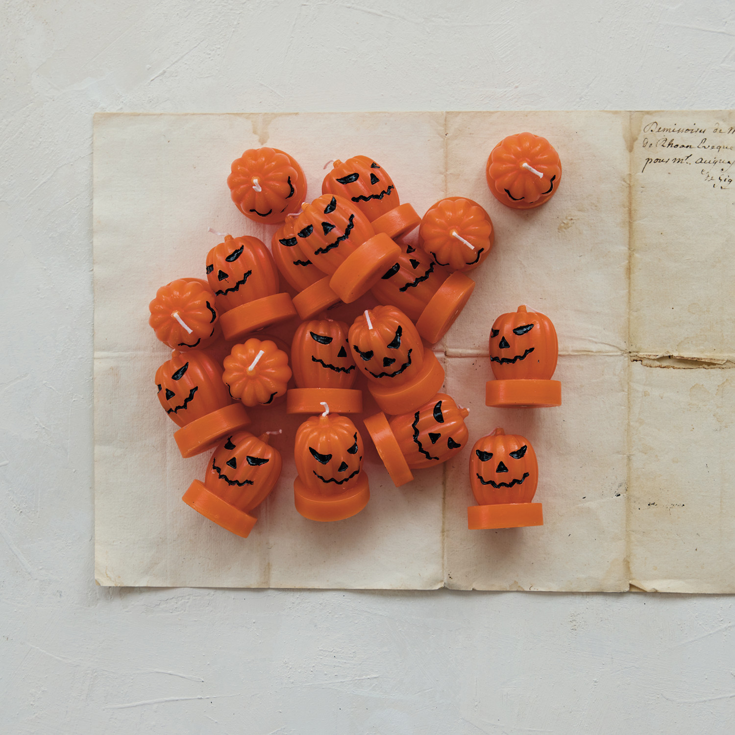 Unscented Jack-O-Lantern Shaped Tealights in Box, Orange Color & Black, Set of 9