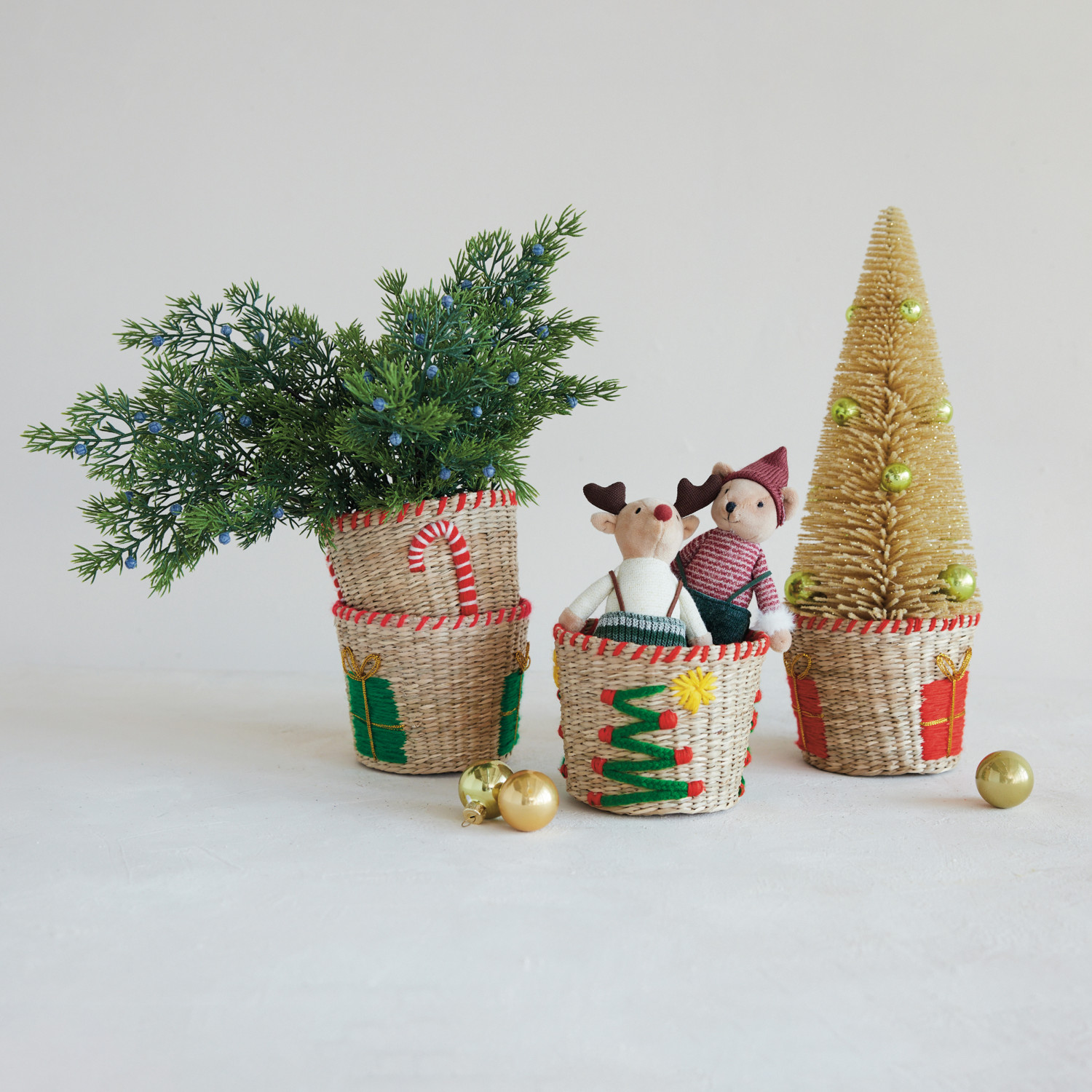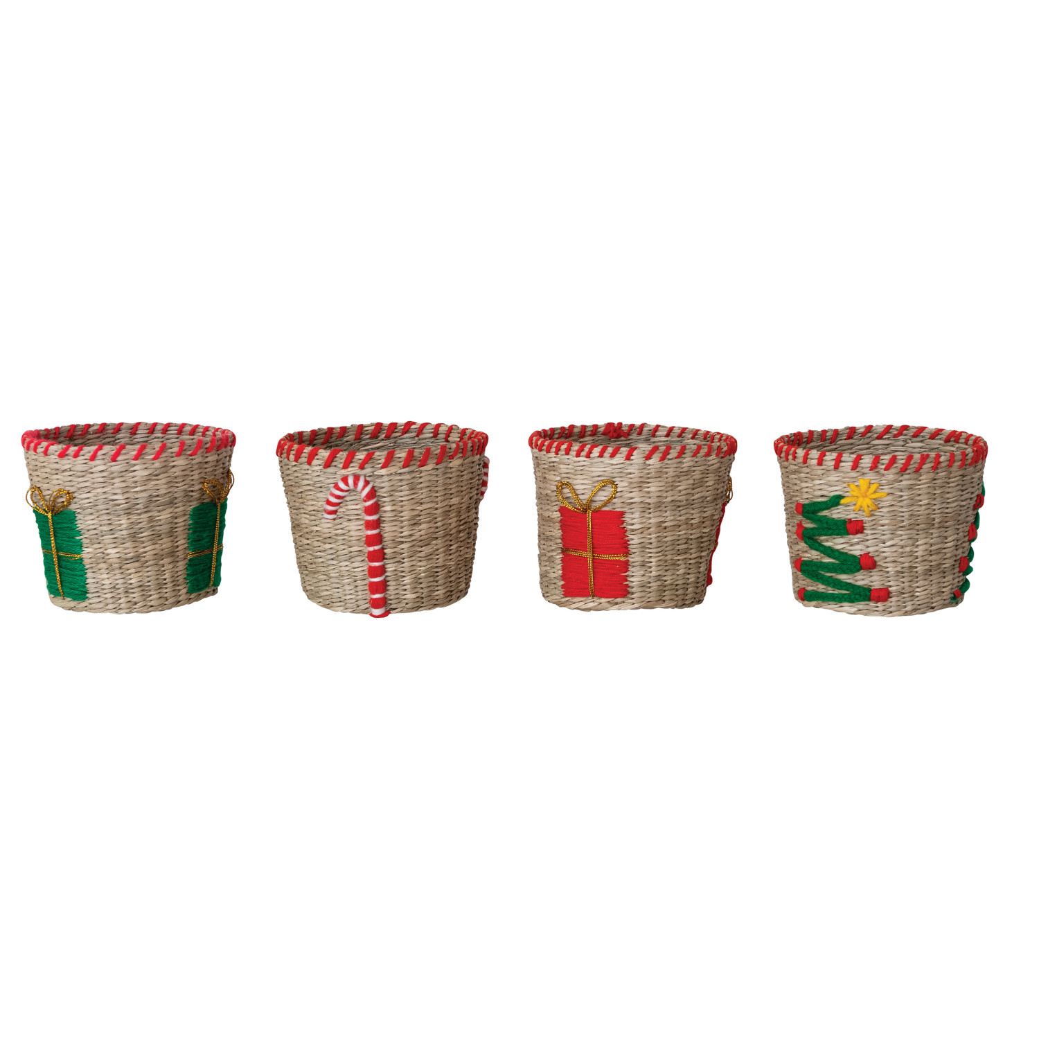 Catalog Name: 5" Round x 4"H Hand-Woven Seagrass & Cotton Basket w/ Embroidered Holiday Icon & Stitched Edge, Multi Color, 4 Styles (Each One Will Vary)