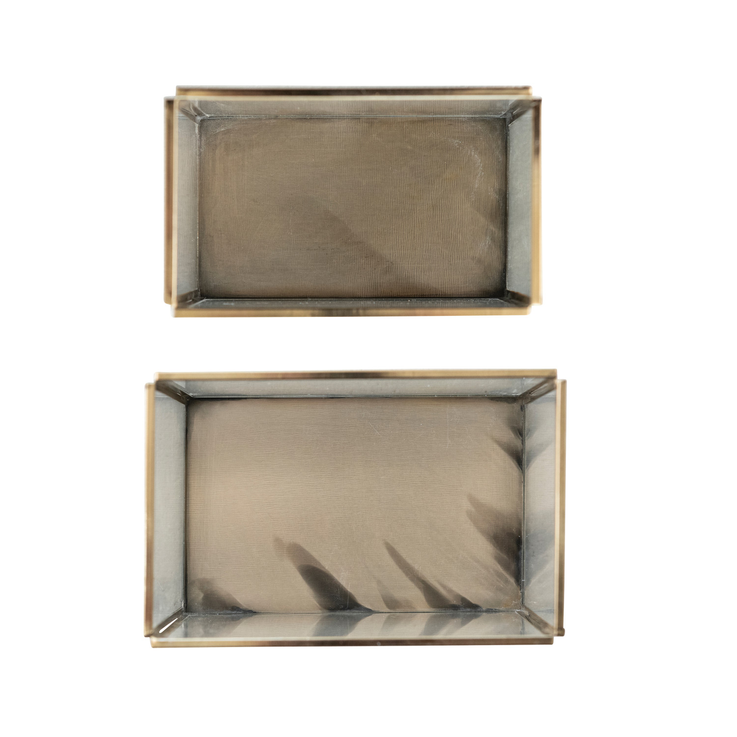Catalog Name: 6-1/2"L x 4-1/4"W x 6"H & 5"L x 3"W x 4-1/2"H Brass & Glass Containers, Antique Gold Finish, Set of 2