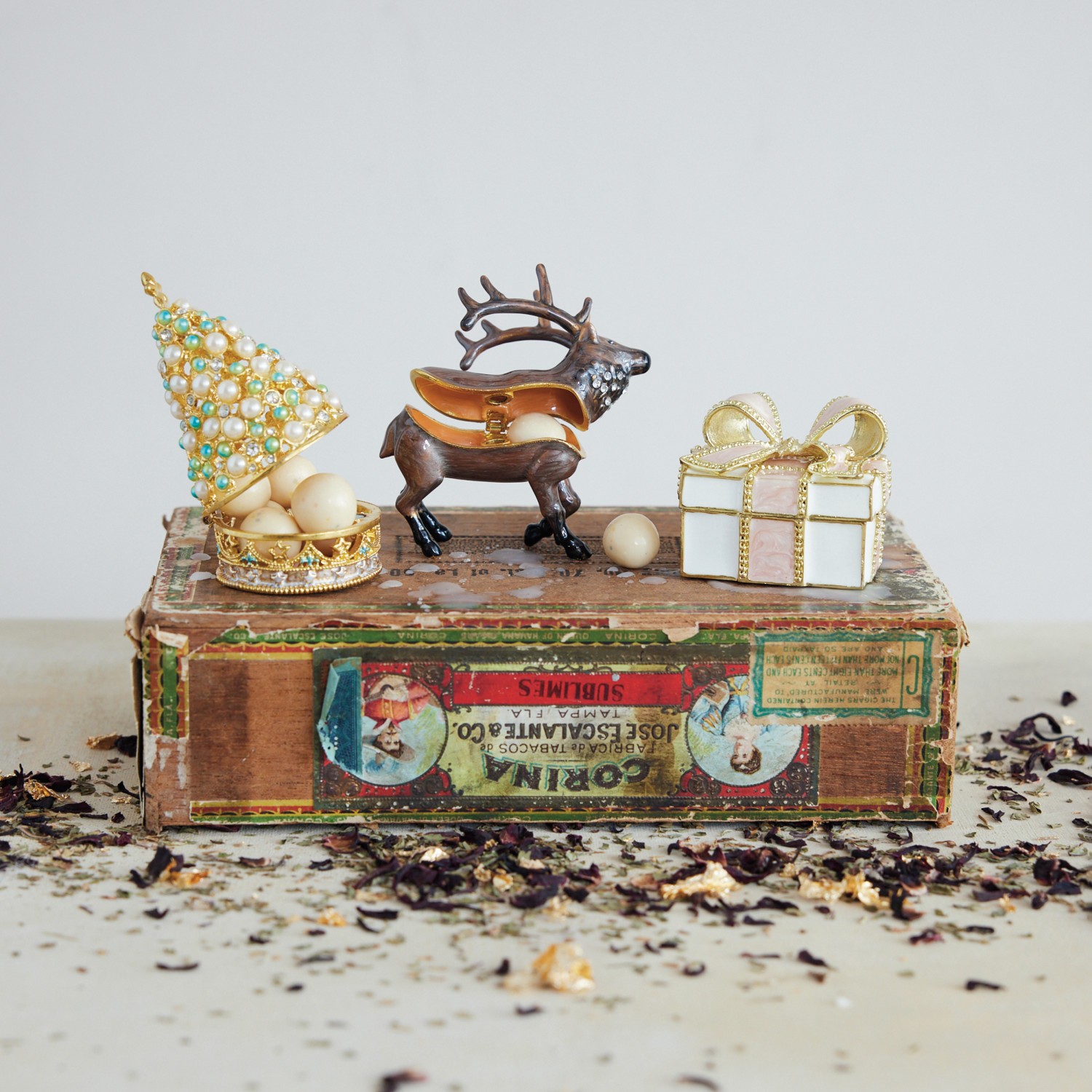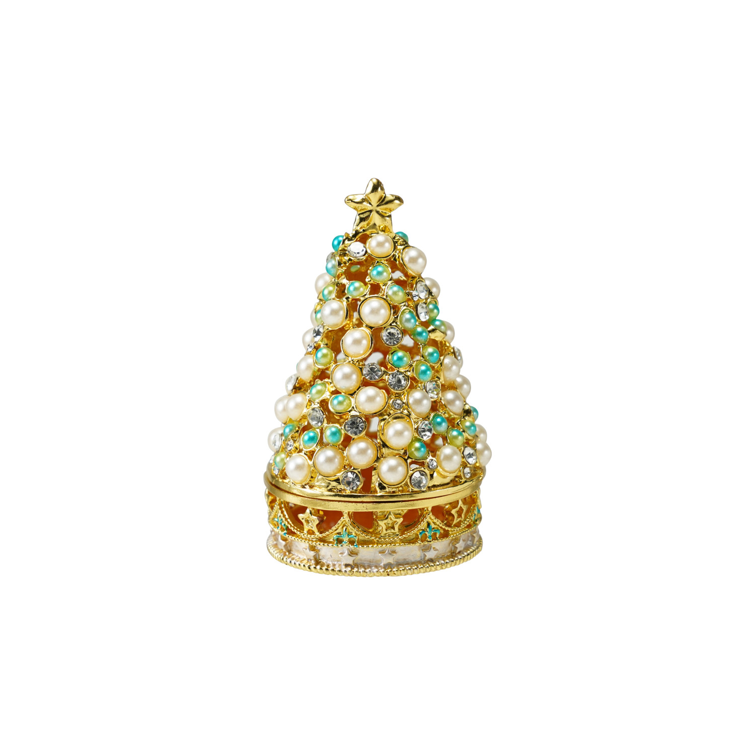 Catalog Name: 2" Round x 3"H Enameled Metal Tree Shaped Trinket Box w/ Stars, Jewels & Faux Pearls, Gold Finish & Multi Color