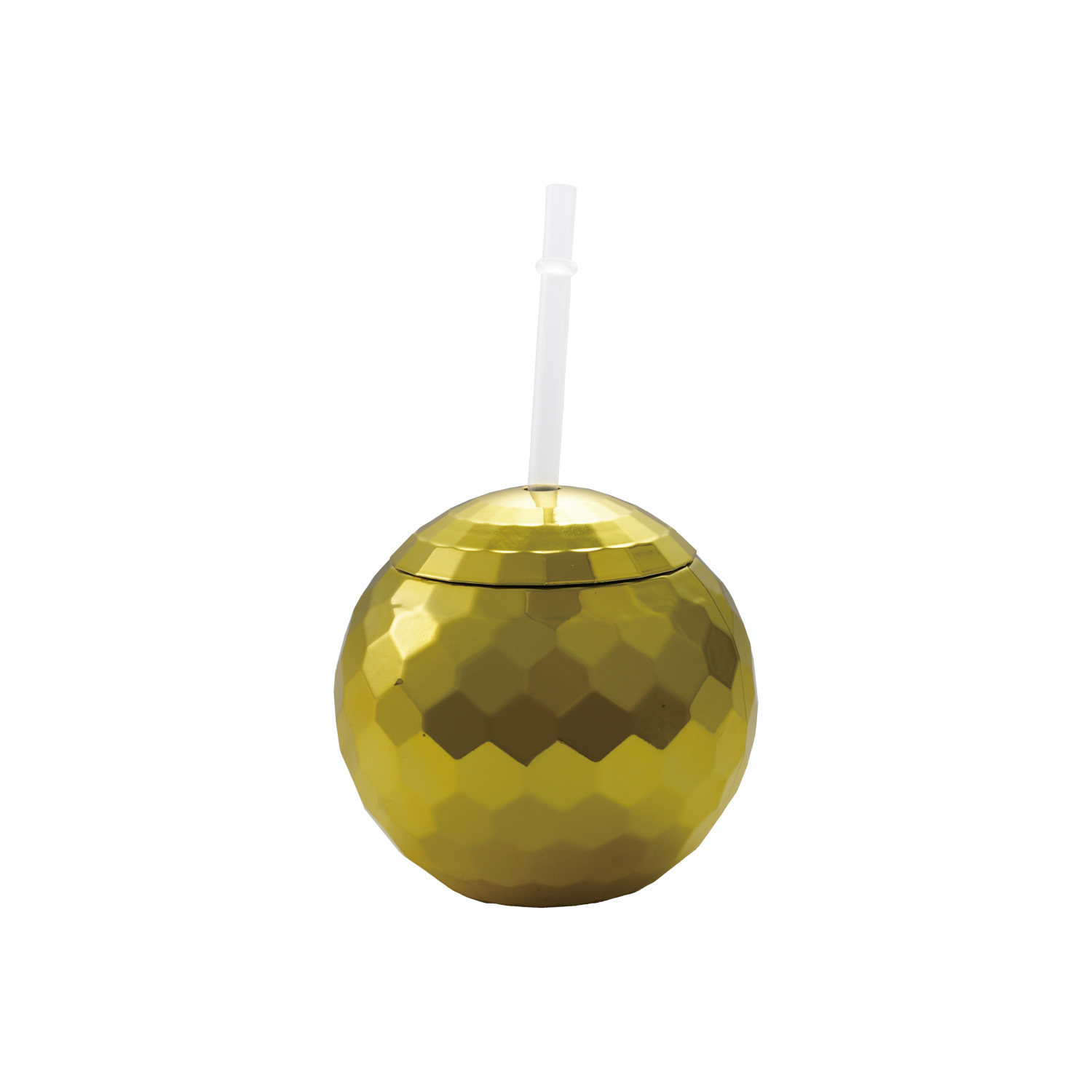 Catalog Name: 4-1/4" Round 20 oz. Plastic Mirror Ball Cup w/ Lid & Straw, Gold Color, Set of 2