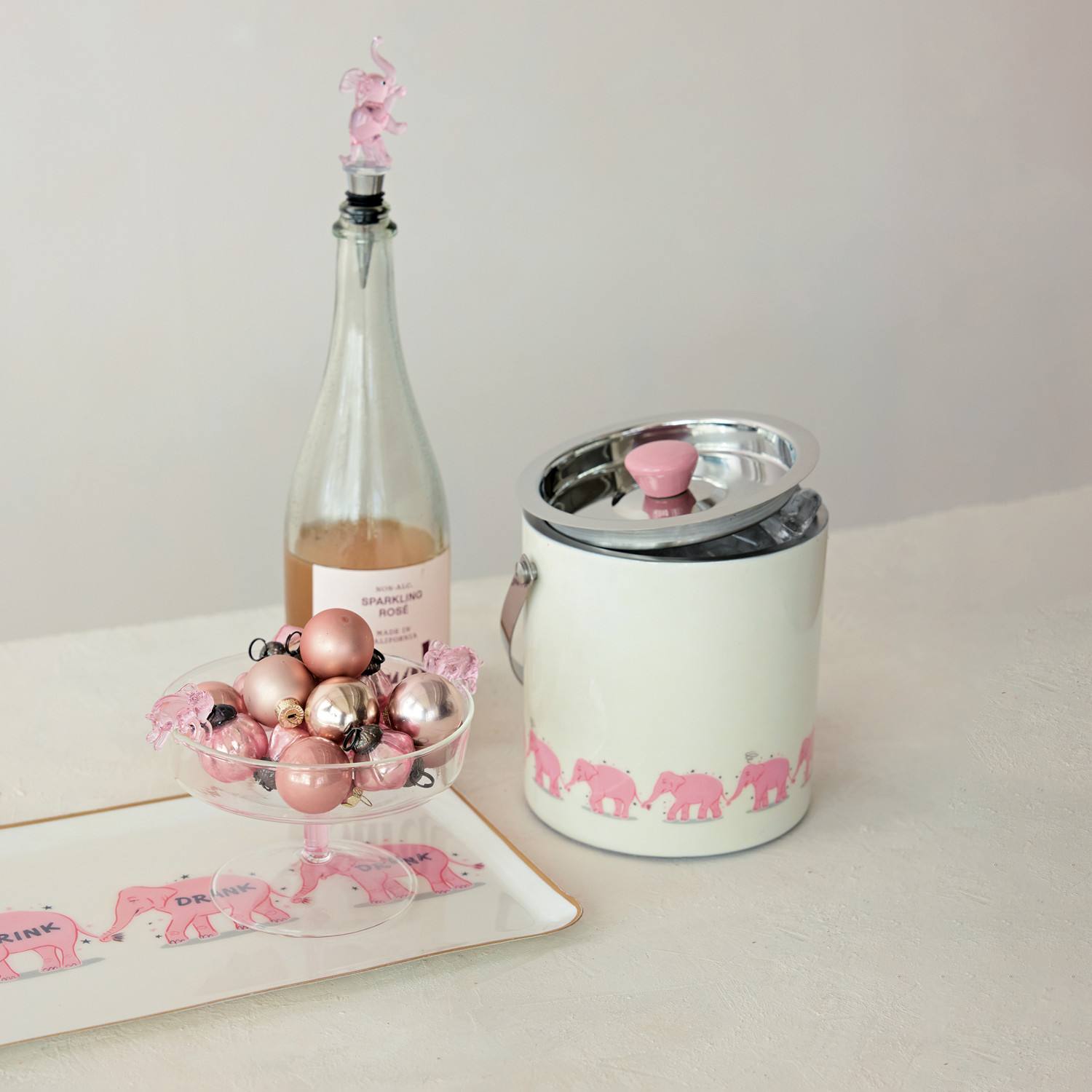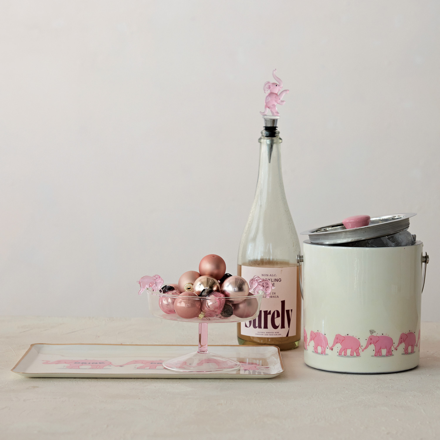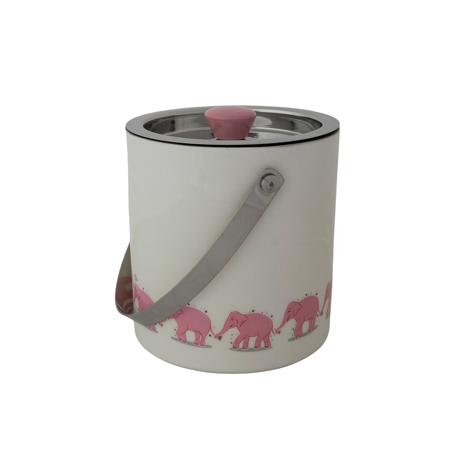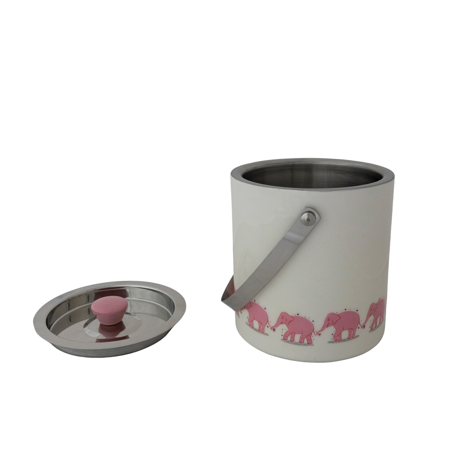 1-1/2 Quart Enameled Stainless Steel Ice Bucket with Pink Elephants & Knob & Nickel Finish ©
