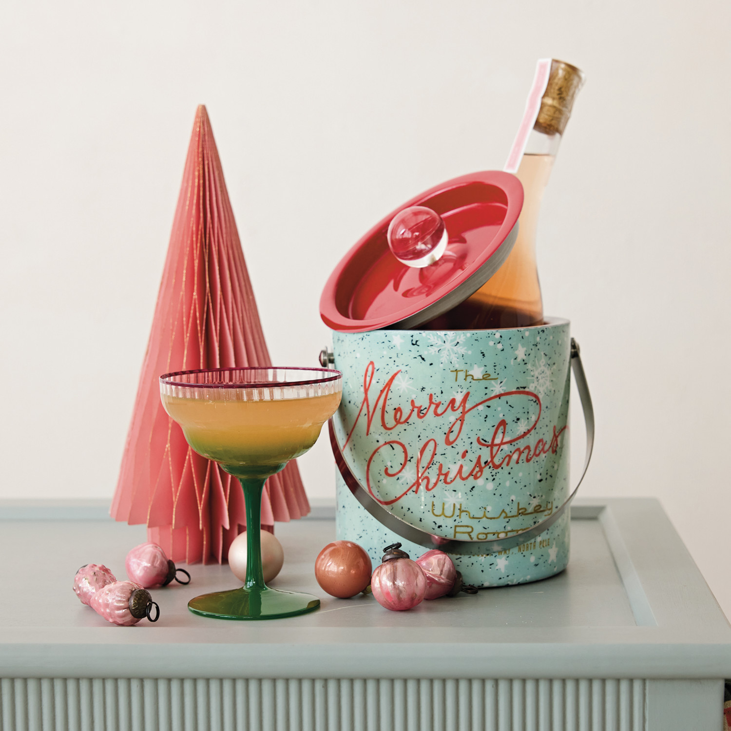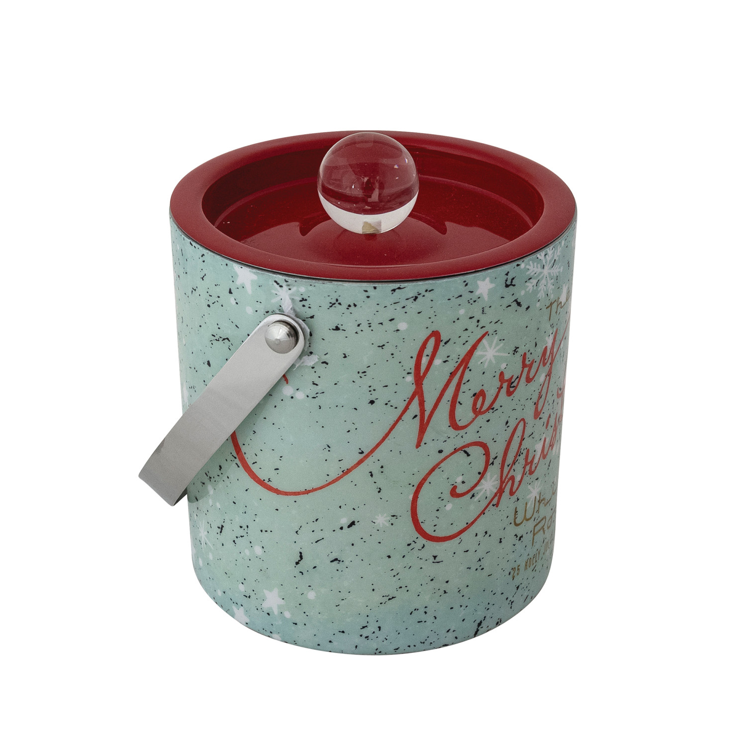 Catalog Name: 6" Round x 7-1/4"H 1-1/2 Quart Enameled Stainless Steel Ice Bucket w/ Snowflakes, Red Lid & Glass Knob "The Merry Christmas...", Multi Color & Nickel Finish ©