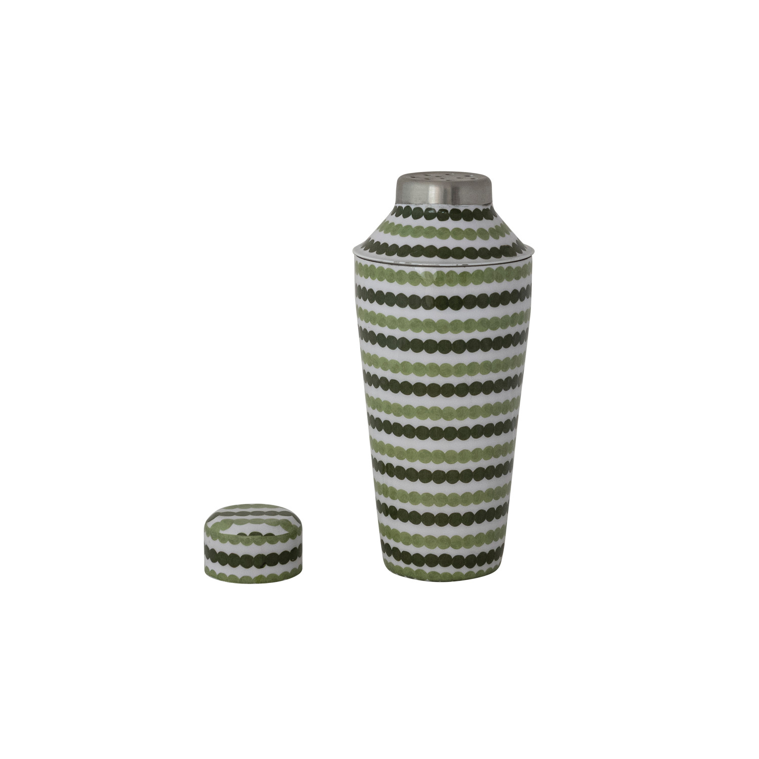 Catalog Name: 3-1/2" Round x 9"H 24 oz. Enameled Metal Cocktail Shaker w/ Dot Pattern, Green & Cream Color ©