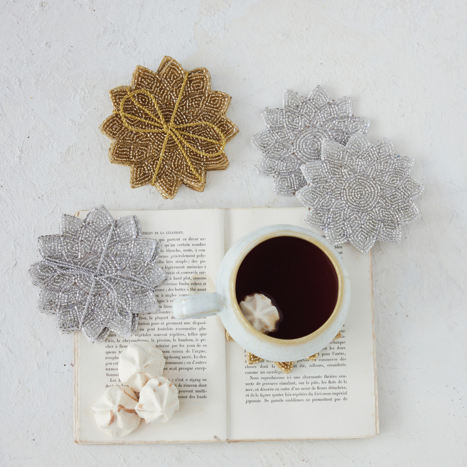 Handmade Beaded Cotton Coasters, Set of 4 Tied with Metallic Cord, 2 Colors