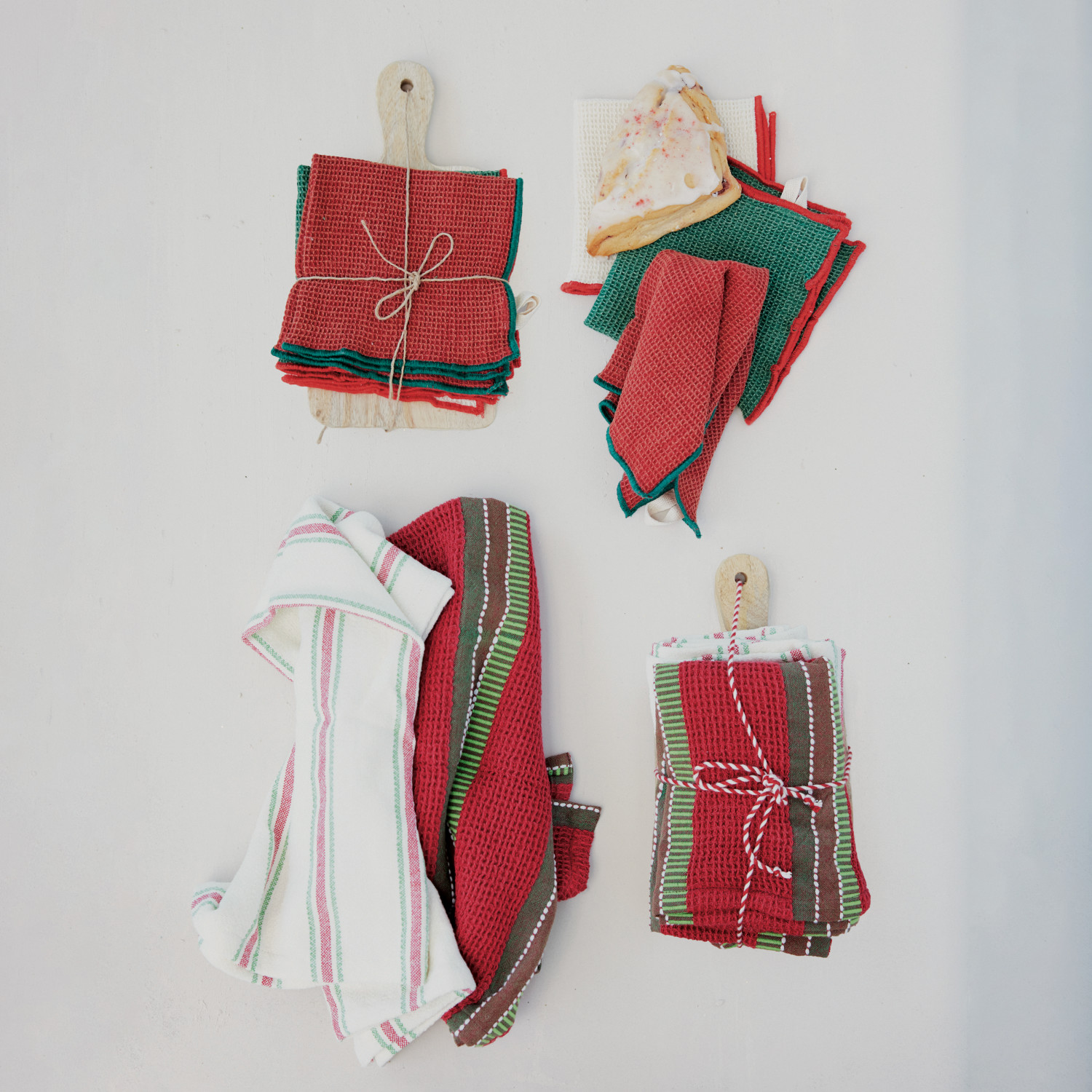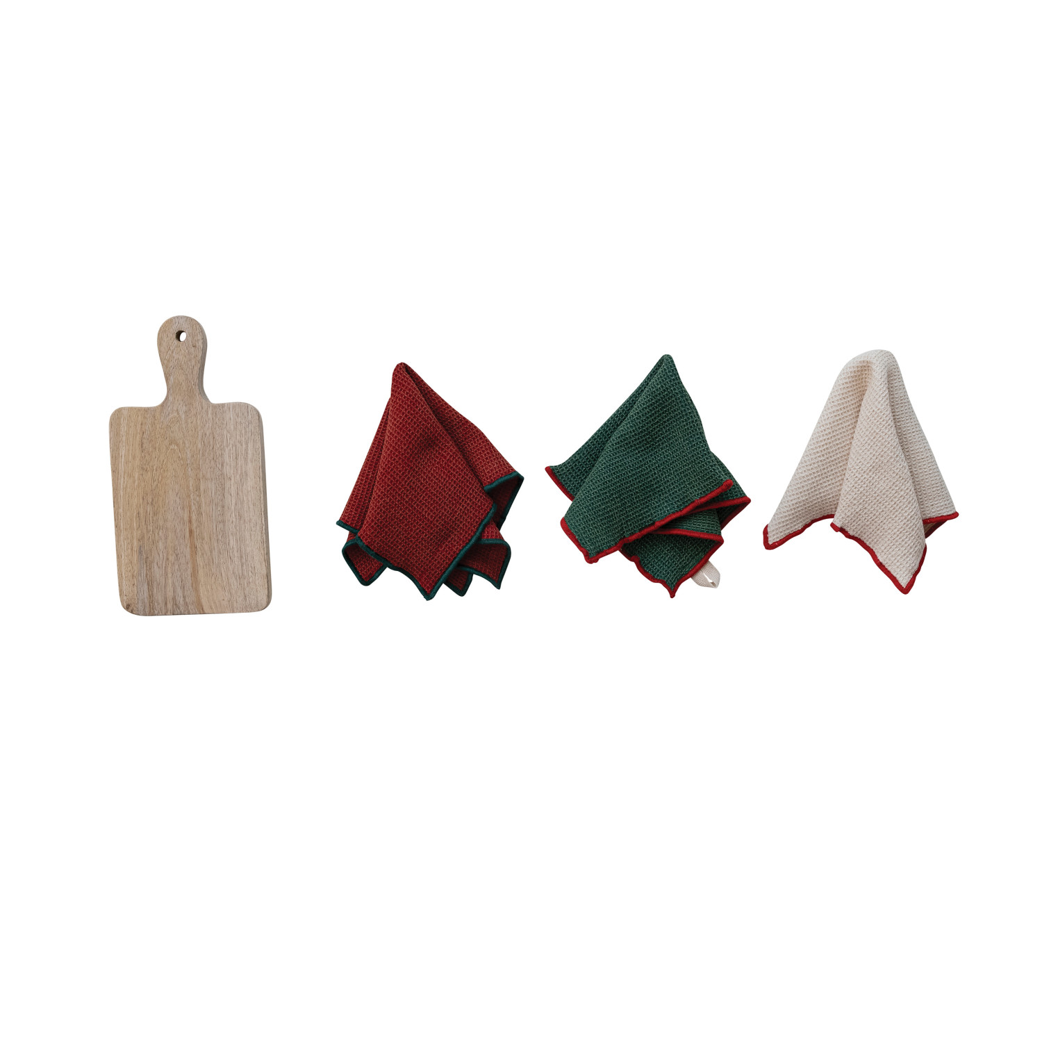 Catalog Name: 10-1/2" Square (3) Cotton Waffle Weave Dish Cloths w/ Stitched Edge, Loop & 10"L x 5"W Mango Wood Cheese/Serving Board w/ Handle, Set of 4 Tied w/ Jute