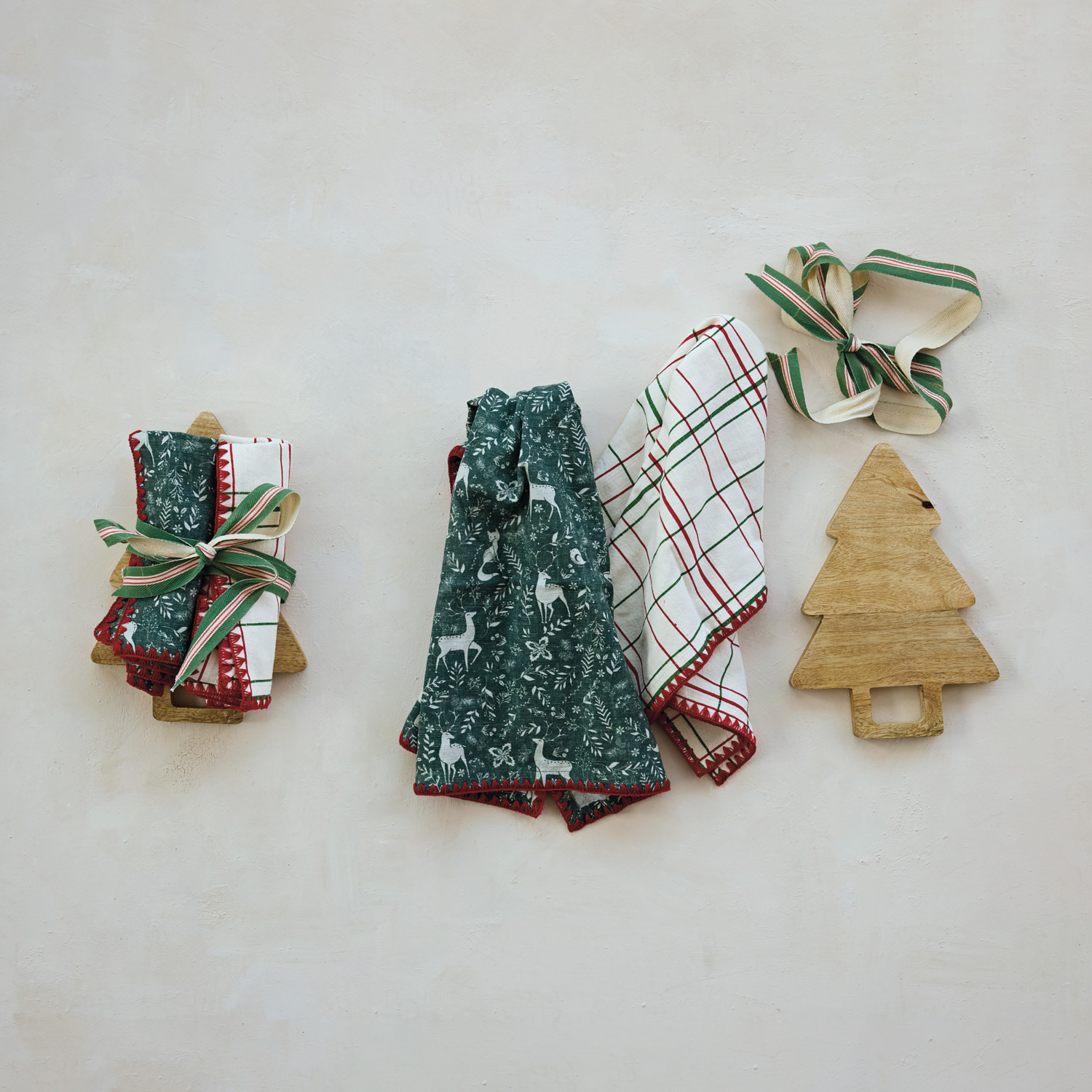 Catalog Name: 28"L x 18"W Cotton Printed Tea Towels w/ Holiday Patterns, Blanket Stitch Edge & 10"L x 7"W Mango Wood Tree Shaped Cheese/Serving Board w/ Handle, Multi Color & Natural, Set of 3 Tied w/ Striped Cotton Tape