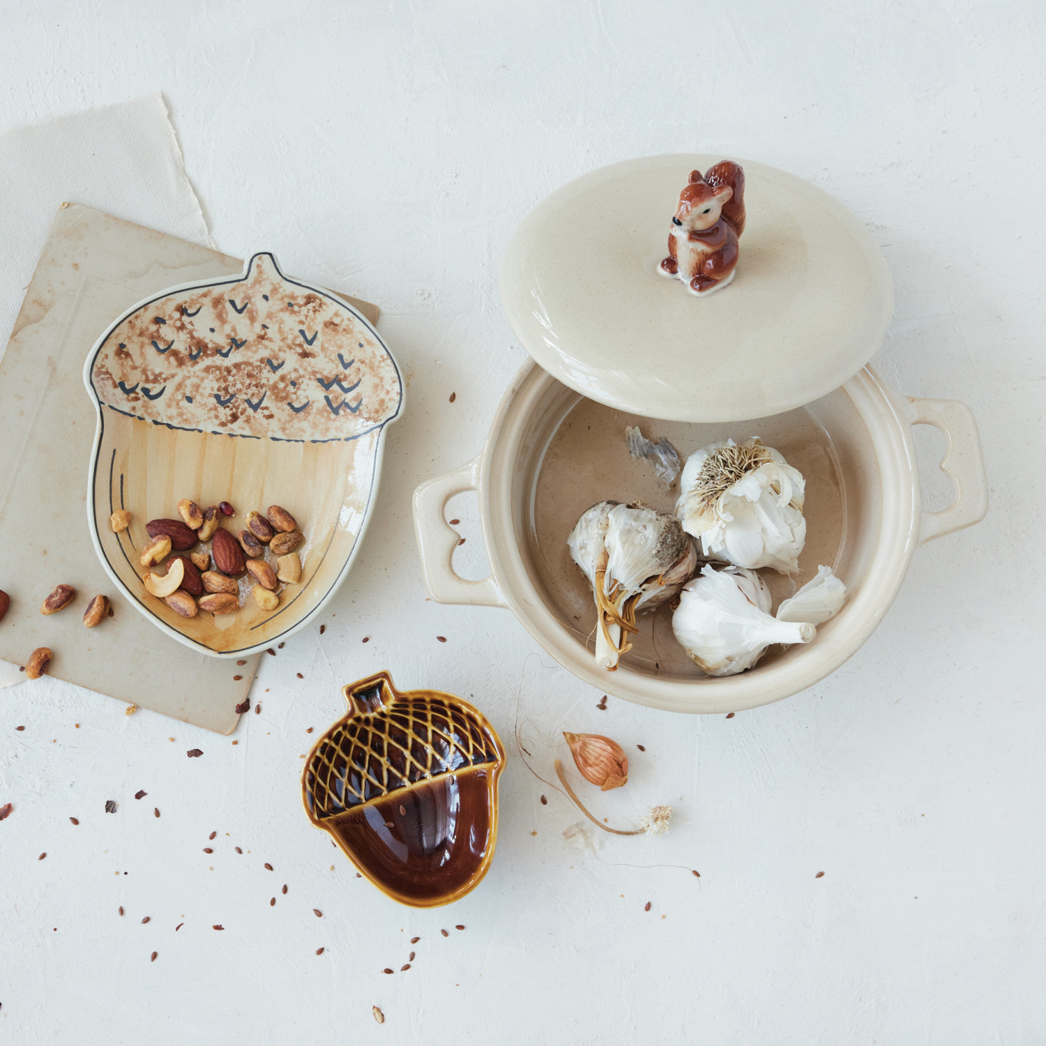 Catalog Name: 7" Round x 3"H 2 Cup Stoneware Baker w/ Squirrel Finial & Handles, Brown & Beige