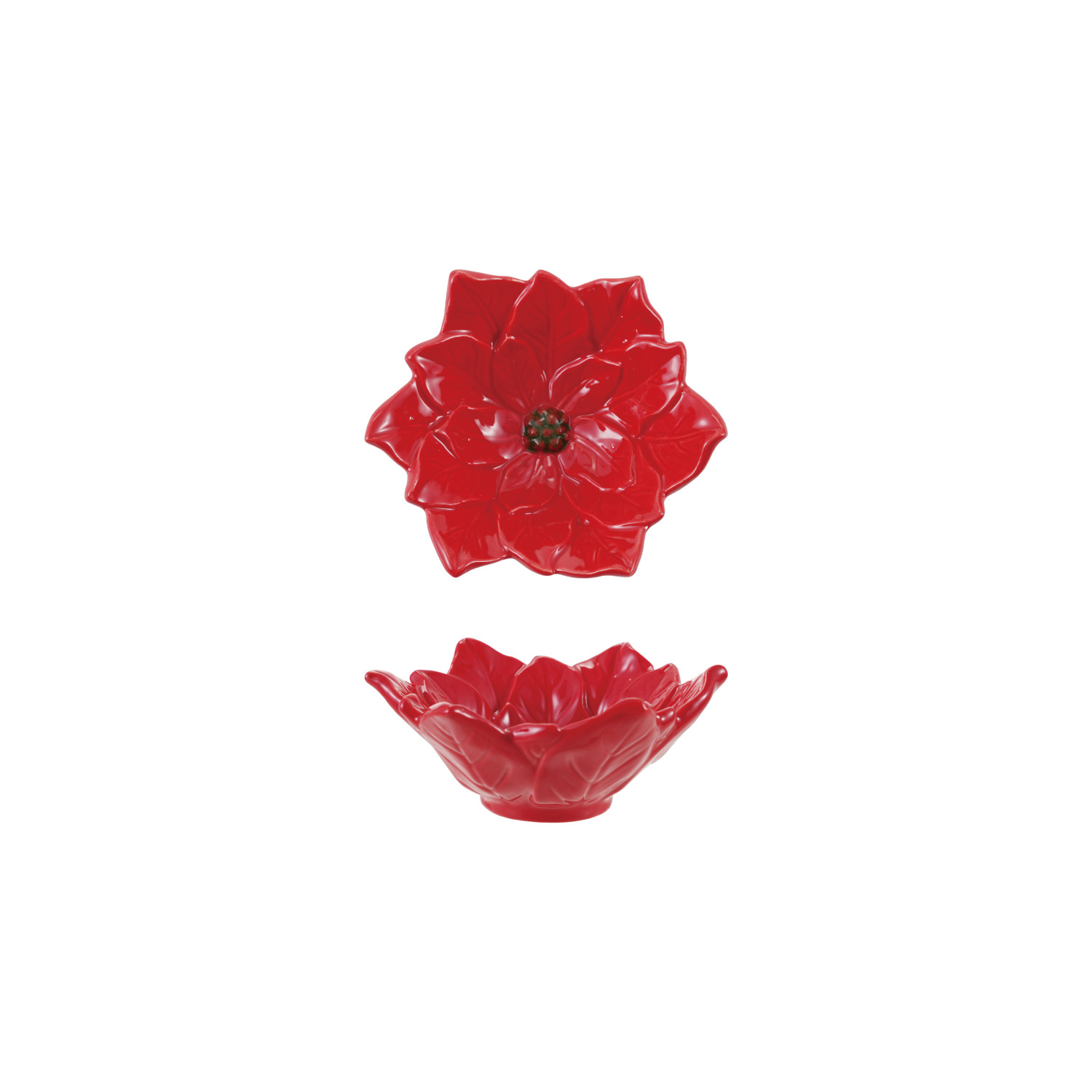 Catalog Name: 4-1/2" Round x 1-3/4"H Hand-Painted Ceramic Poinsettia Shaped Dish, Red & Green
