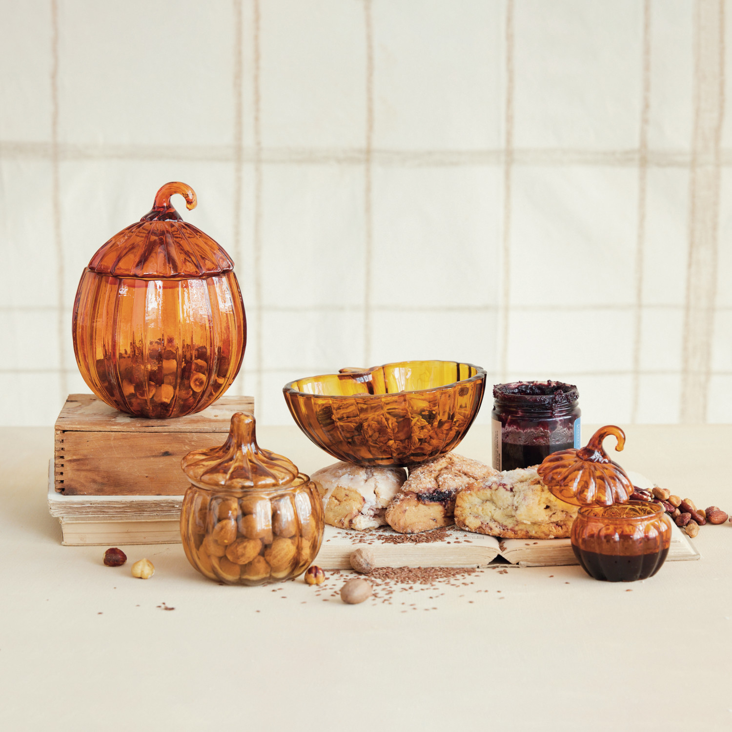 Hand-Blown Glass Pumpkin Shaped Jar with Lid, Amber Color