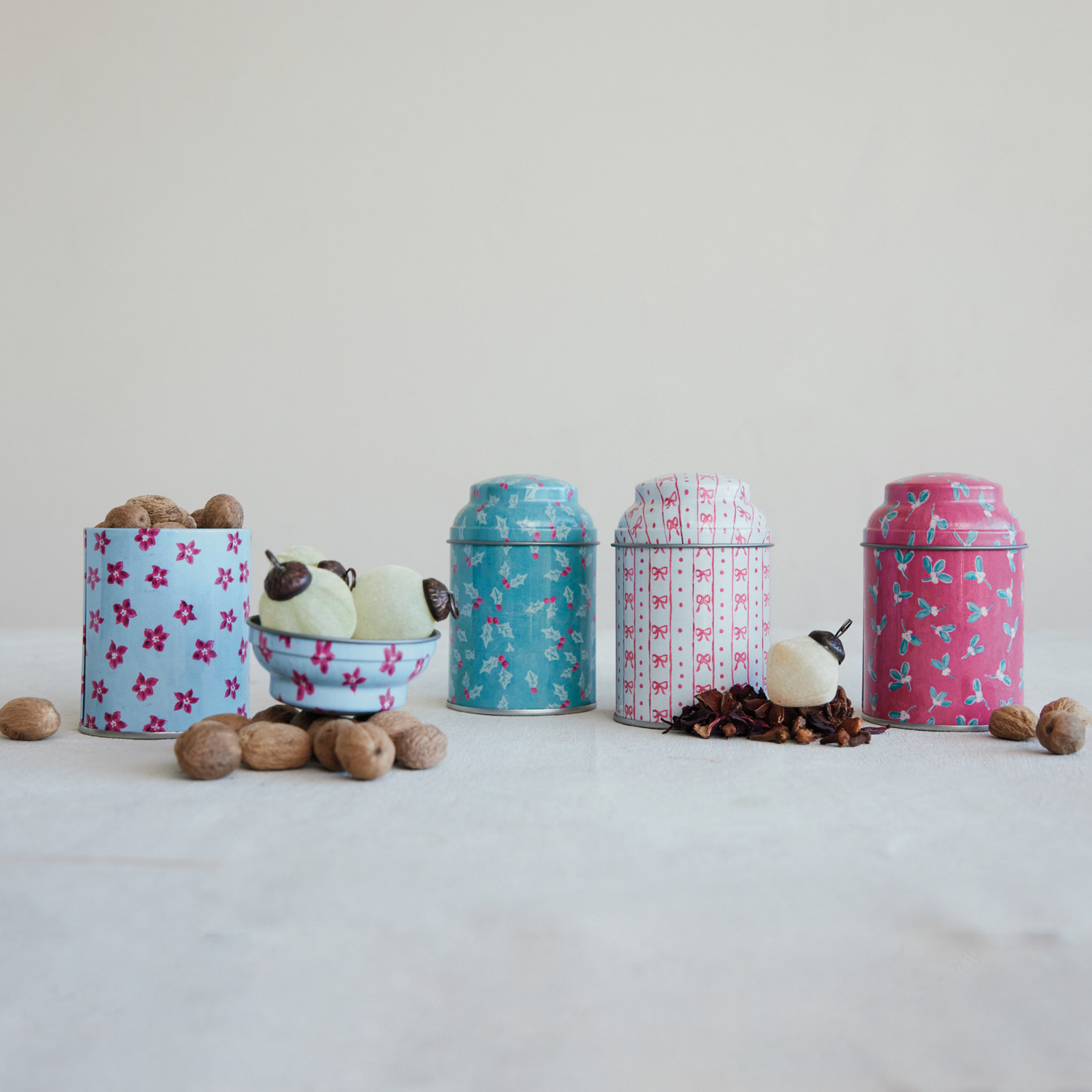 Tin Container with Lid & Holiday Pattern, 4 Styles ©