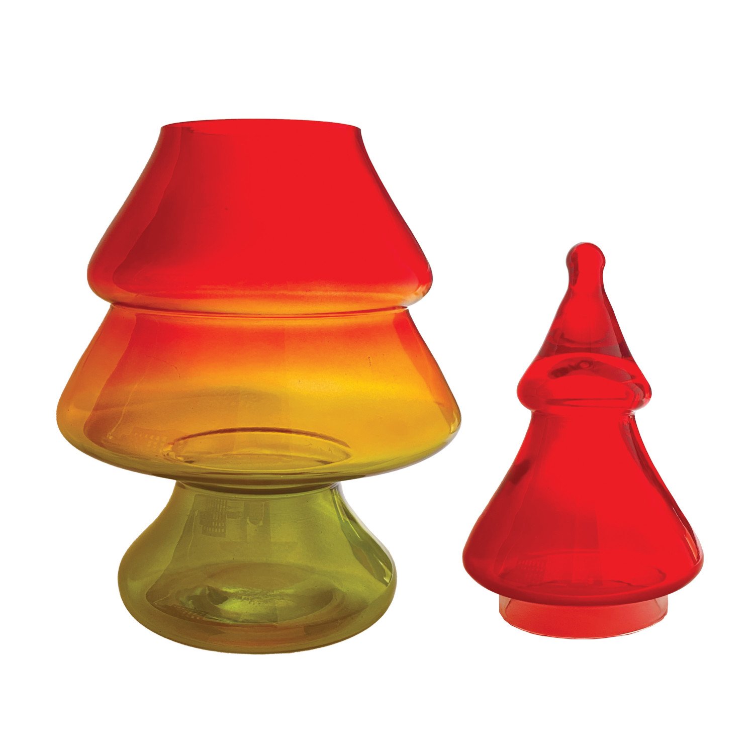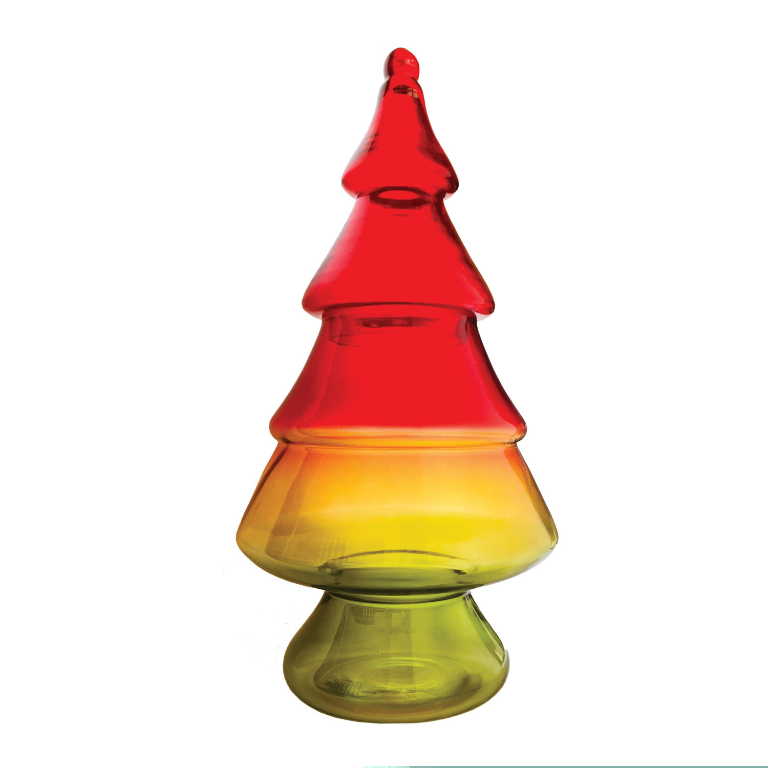 Catalog Name: 7-3/4" Round x 15"H Hand-Blown Glass Tree Shaped Jar w/ Lid, Red, Yellow & Green