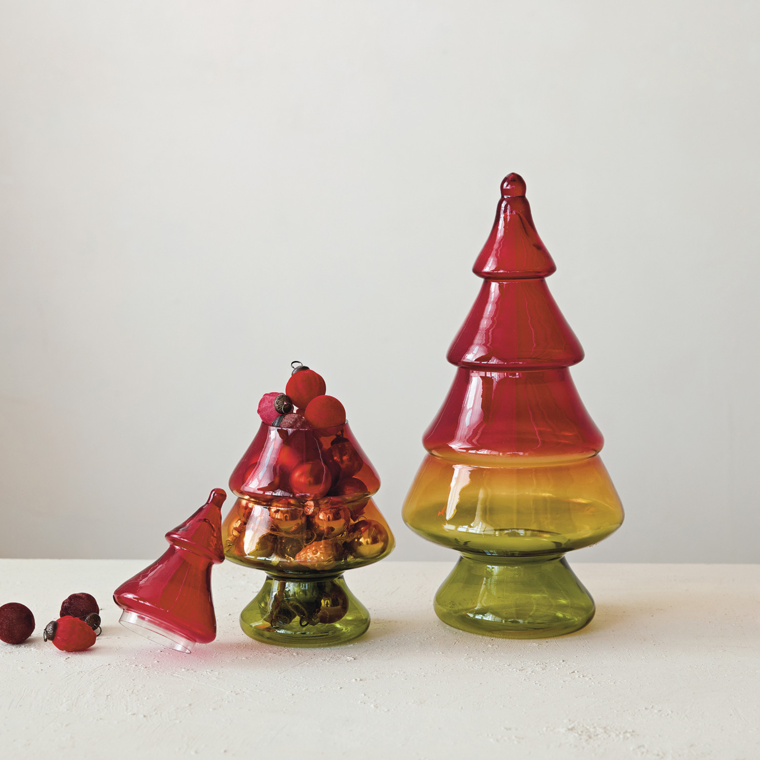 Hand-Blown Glass Tree Shaped Jar with Lid, Red