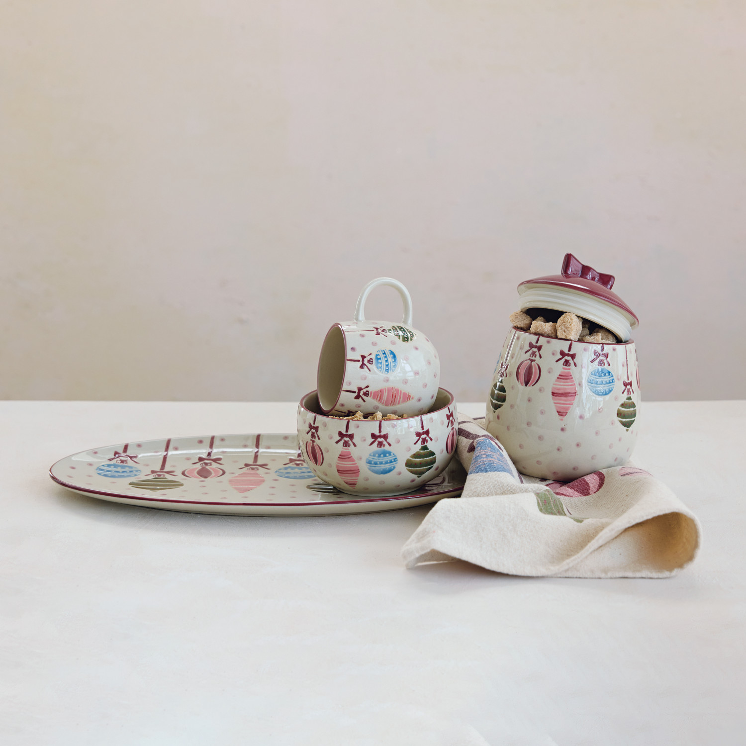 Hand-Painted Stoneware Canister with Wax Relief Ornaments, Dots & Lid with Bow Shaped Handle