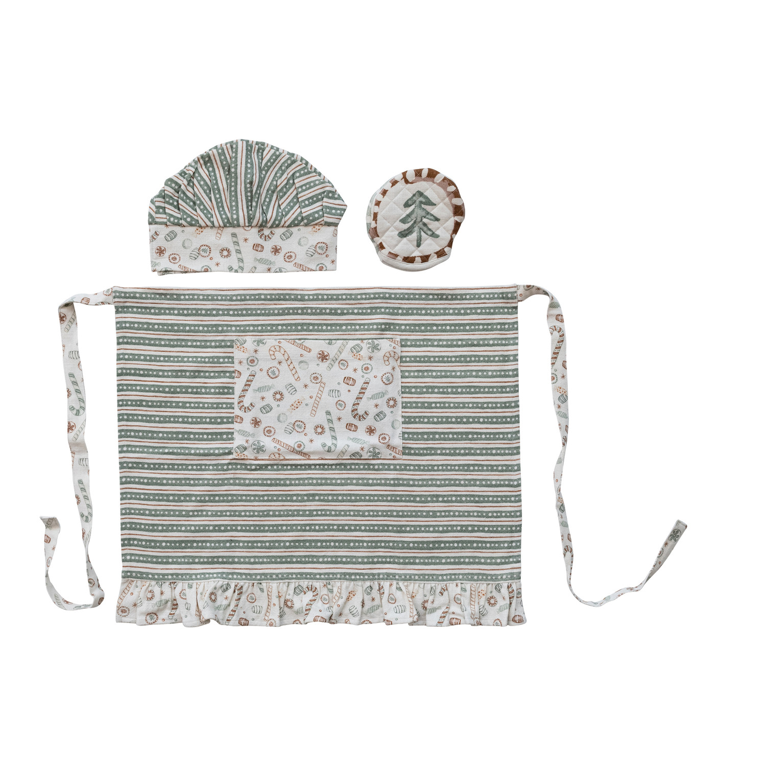 Catalog Name: 24"L x 20"W Child Ruffled Apron w/ Chef Hat, Oven Mitt & Holiday Pattern, Multi Color, Set of 3 ©
