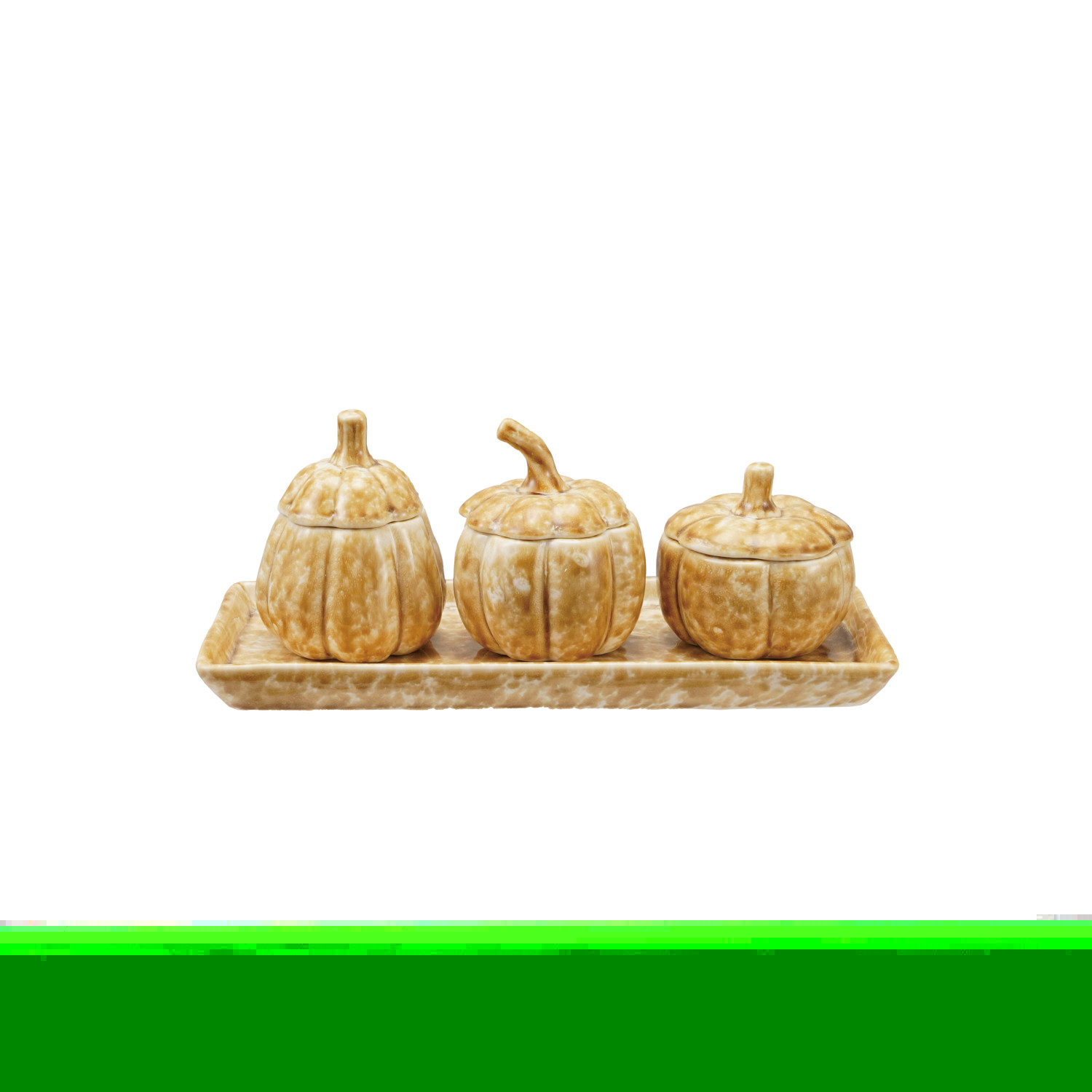 Stoneware Tray with 3 Pumpkin Shaped Jars, Brown, Set of 4 (Each One Will Vary)