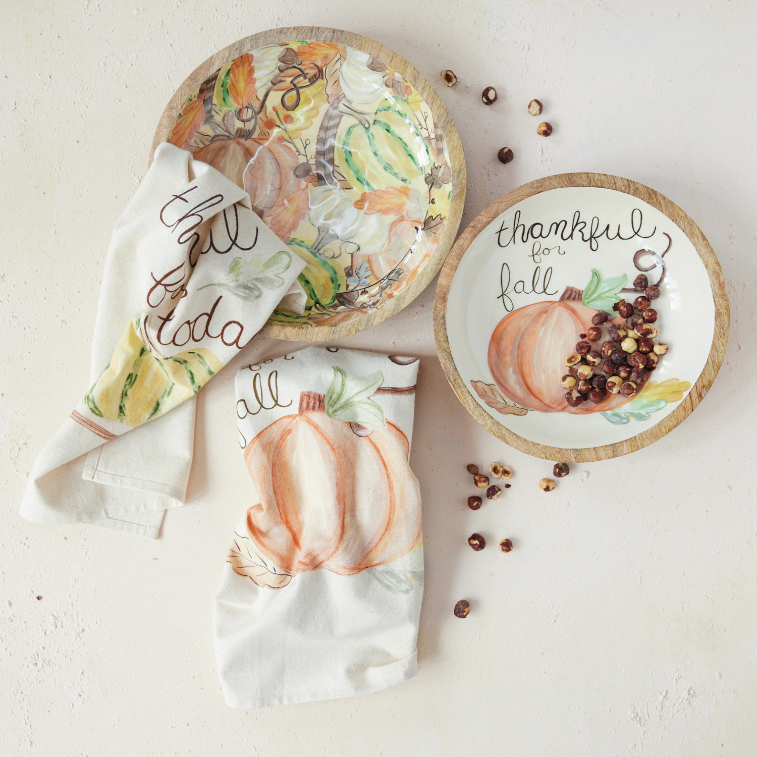 Enameled Mango Wood Bowls with Pumpkins "Thankful for Fall", Set of 2 ©