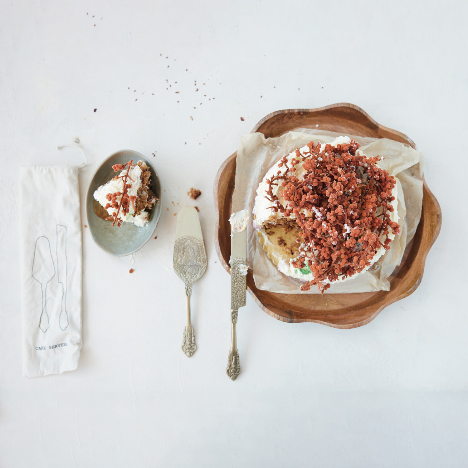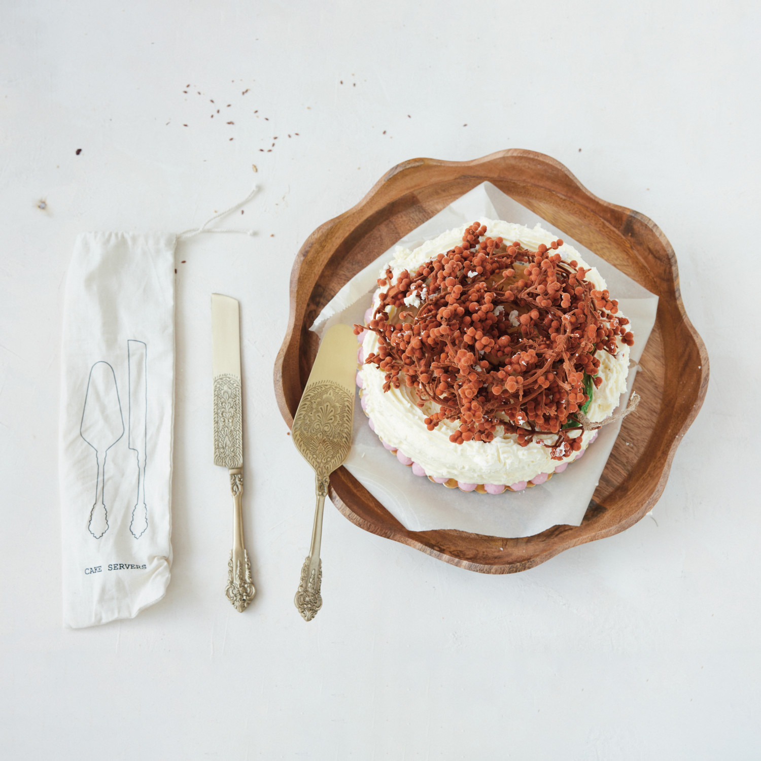 Embossed Brass Cake Servers, Set of 2 in Printed Drawstring Bag