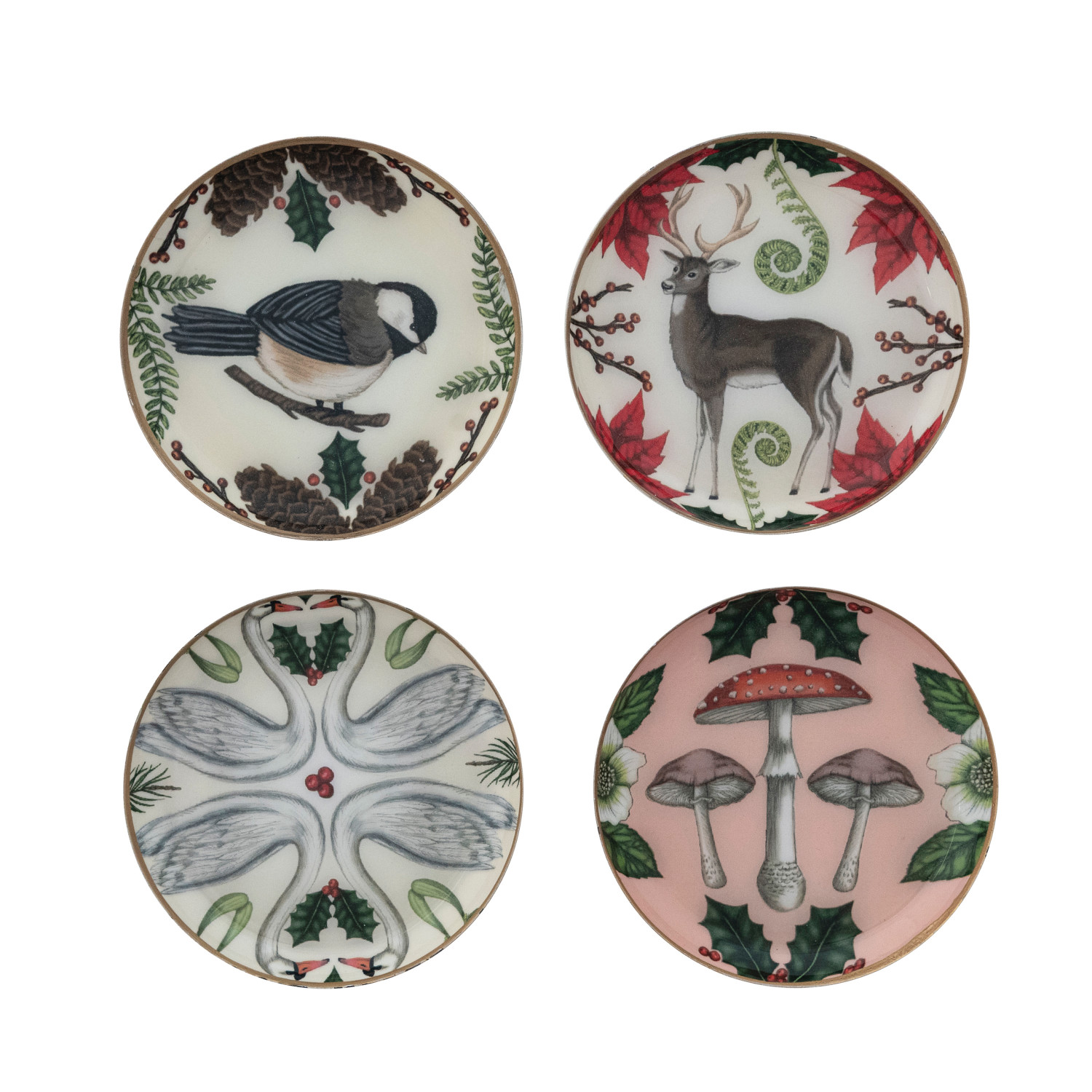 Catalog Name: 4" Round Enameled Metal Dish/Coaster w/ Seasonal Botanicals, Animals & Gold Edge, Multi Color, 4 Styles ©
