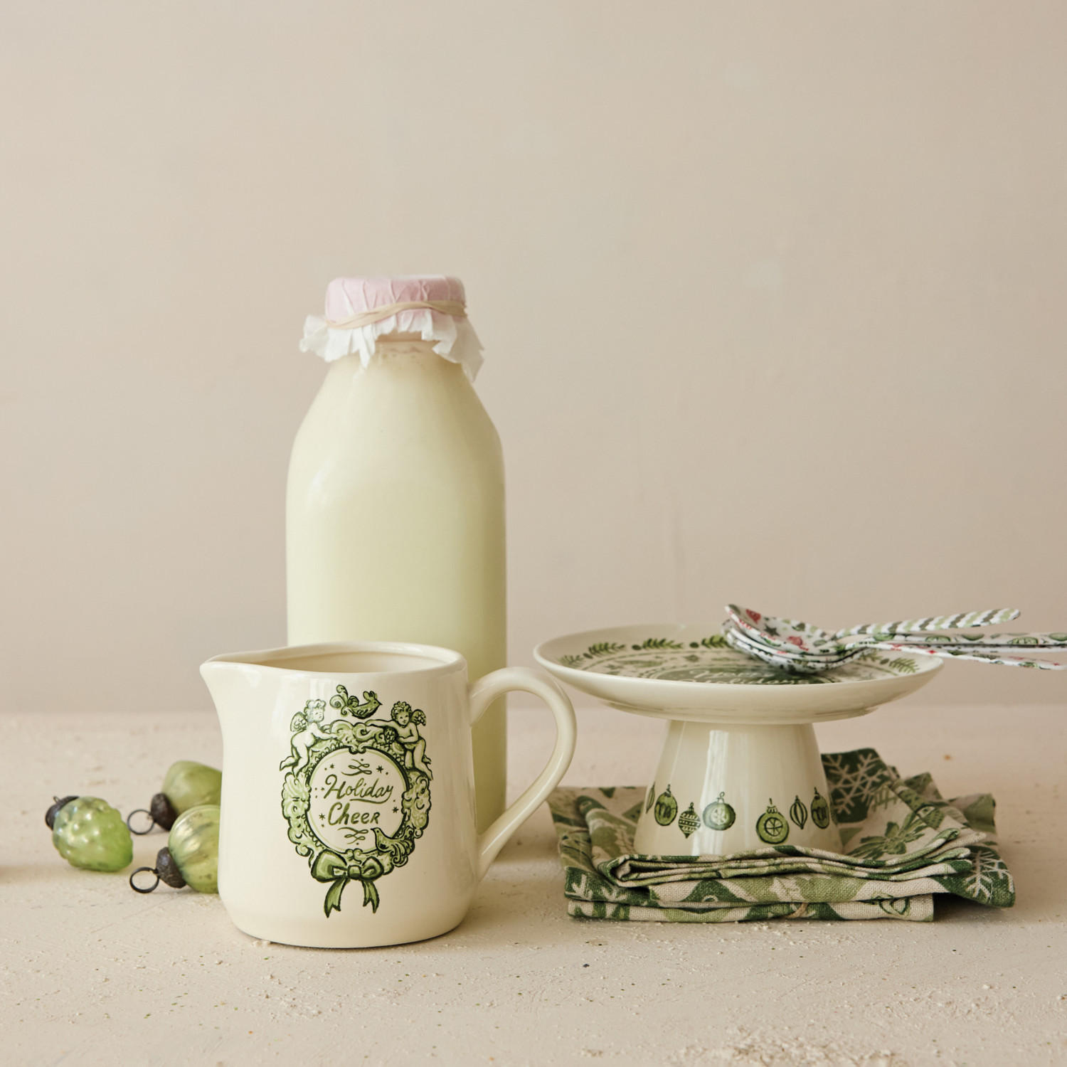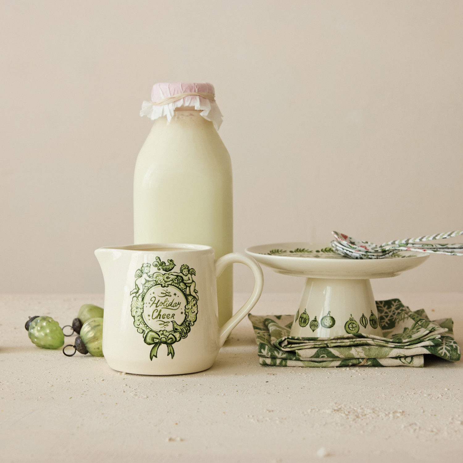 Catalog Name: 6" Round Stoneware Pedestal w/ Holiday Design "Happy Holidays", Green & Cream Color ©