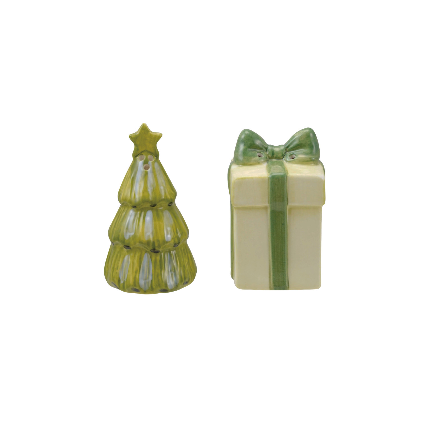 Hand-Painted Stoneware Gift & Tree Shaped Salt & Pepper Shakers, Set of 2 ©
