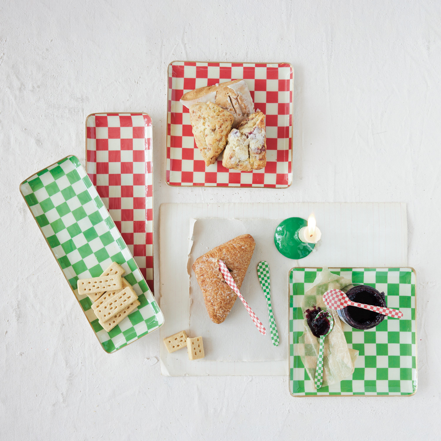 Enameled Metal Tray with Check Pattern & Gold Edges, 2 Colors