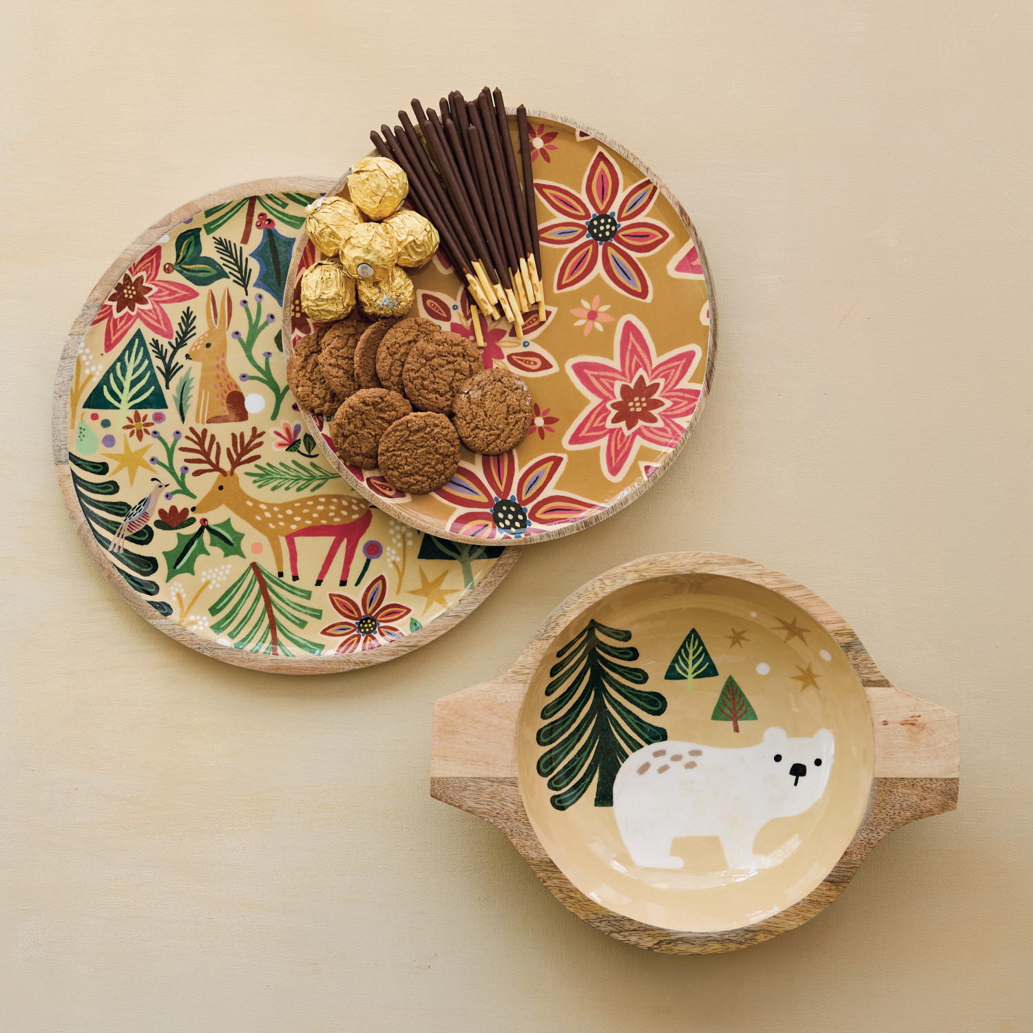 Enameled Mango Wood Bowl with Polar Bear, Trees & Handles ©